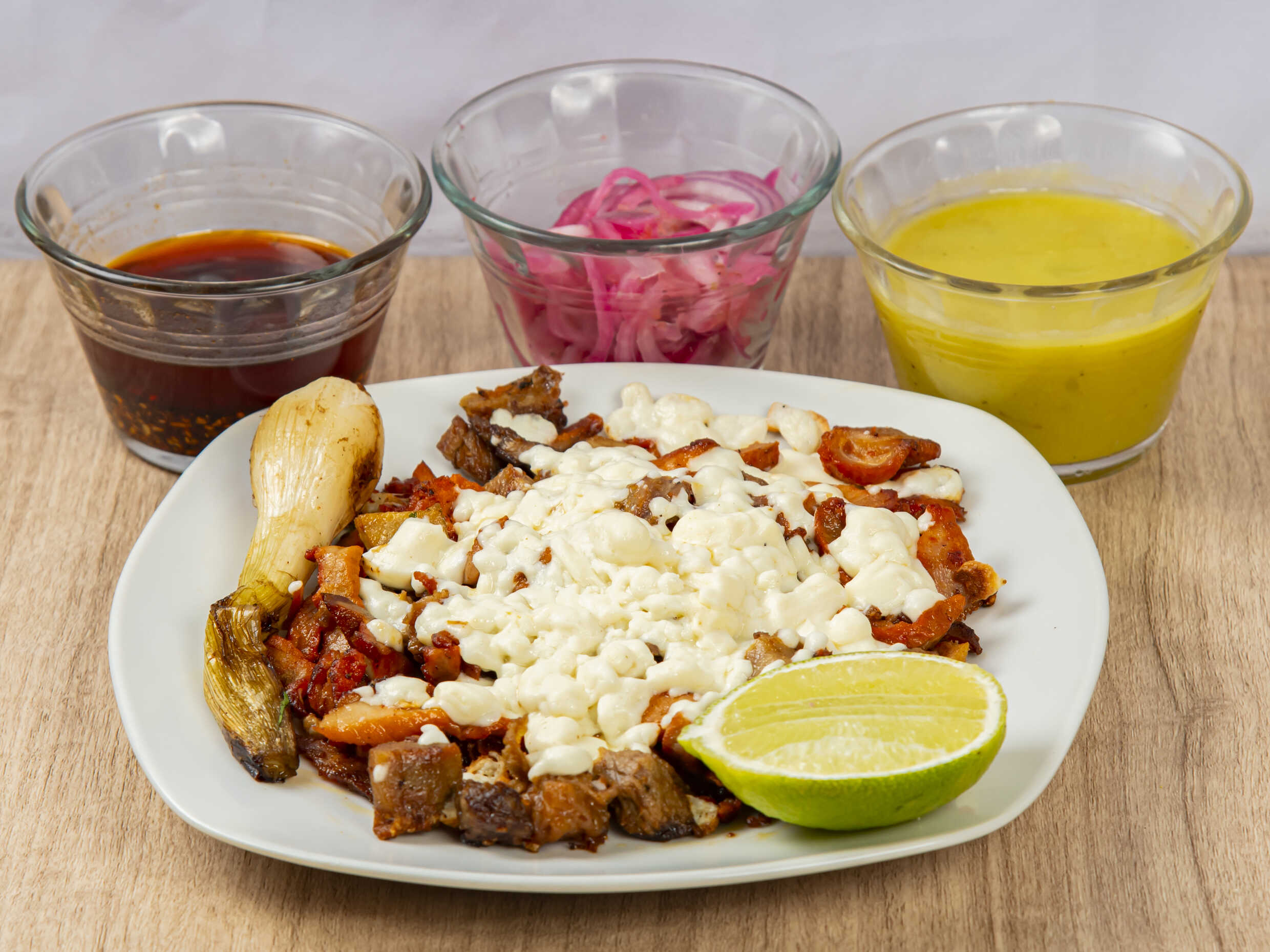 Bistec, pastor, cebolla, tomate, jalapeño y quesillo.