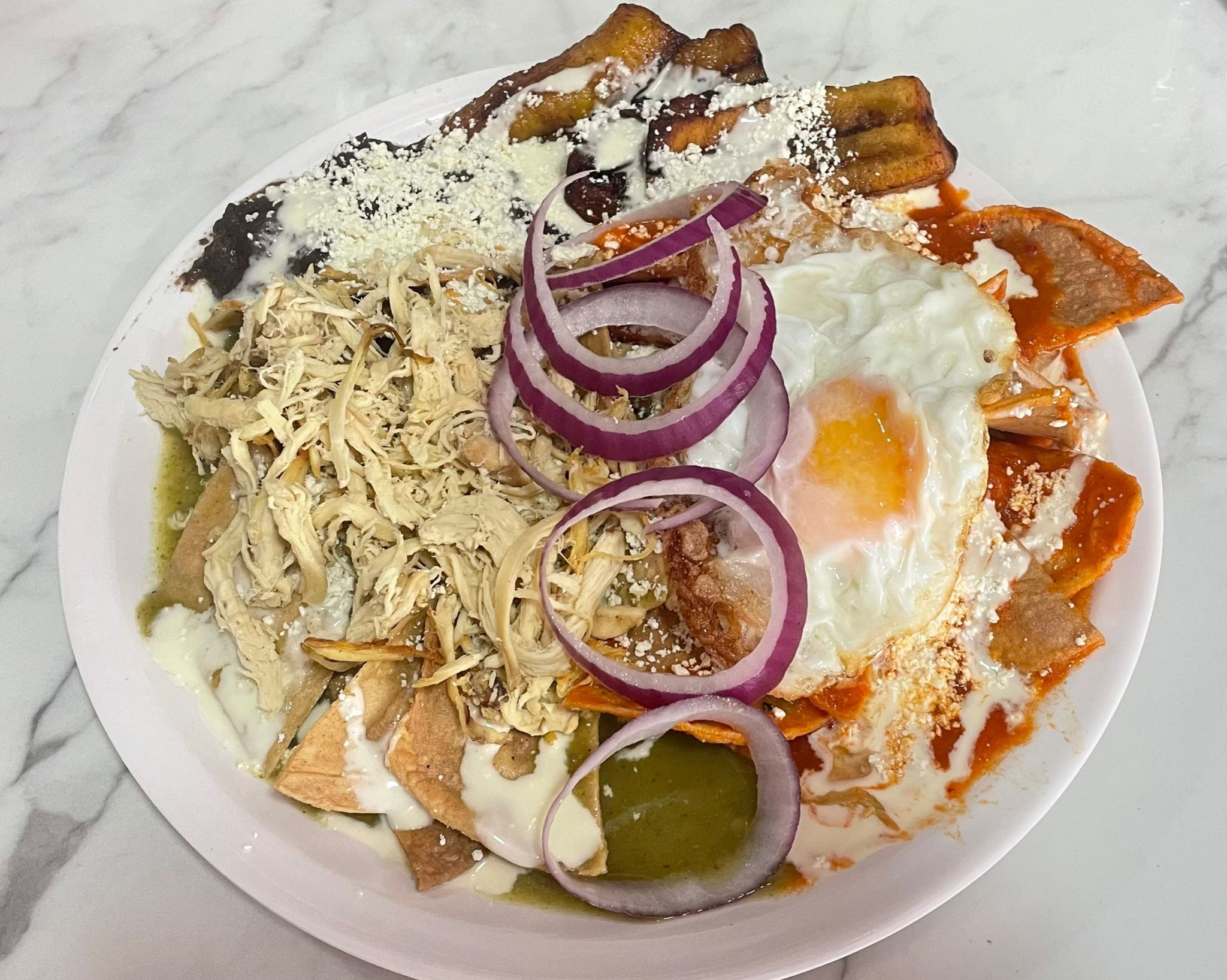 Deliciosos chilaquiles con salsa roja y verde, huevo y pollo, frijoles
