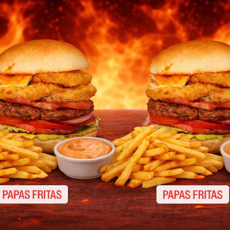 Hamburguesa BBQ*2 + Hamburguesa Pollo BBQ*1 + Extra tocineta*1 + Orden de Papas Fritas*2