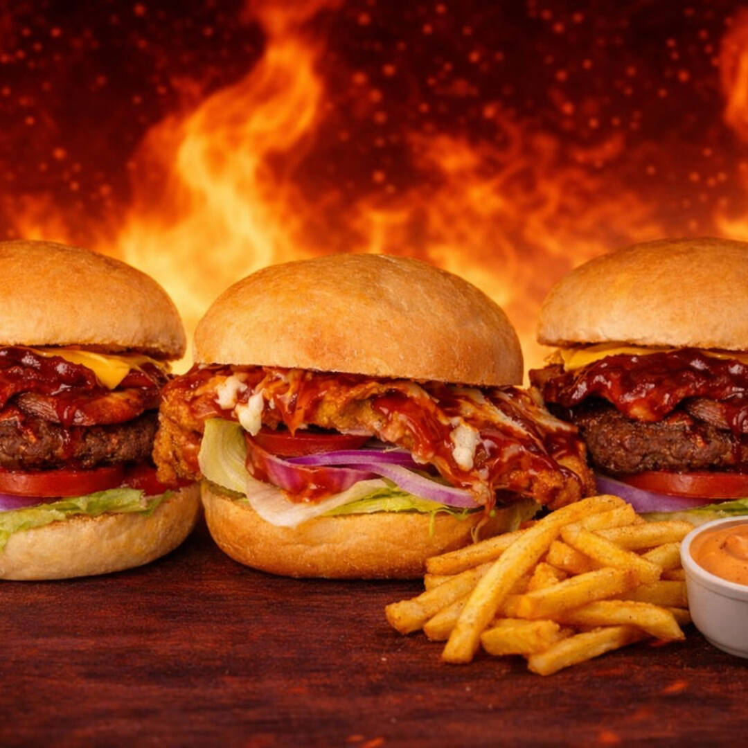 Hamburguesa con carne 100% res, pan artesanal, bañada en salsa BBQ, queso chihuahua, queso amarillo gratinado, tocino, cebolla morada, tomate, lechuga y aderezo cremoso de chipotle.