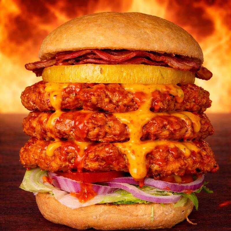 Hamburguesa con carne 100% res, pan artesanal, bañada en salsa búfalo, queso chihuahua, queso amarillo gratinado, tocino, cebolla morada, lechuga, tomate y aderezo cremoso de chipotle.