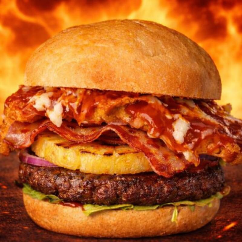 Hamburguesa Pollo BBQ*1 + 🍍 piña*1 + Extra tocineta*1 + Extra de Carne*1 + Salsa BBQ*1
