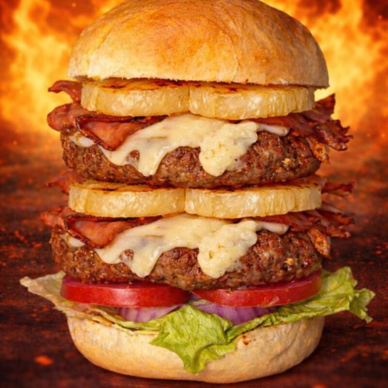 Hamburguesa con carne 100% res, pan artesanal, piña asada, queso manchego, queso amarillo gratinado, tomate, cebolla morada, lechuga, tocino y aderezo cremoso de chipotle.