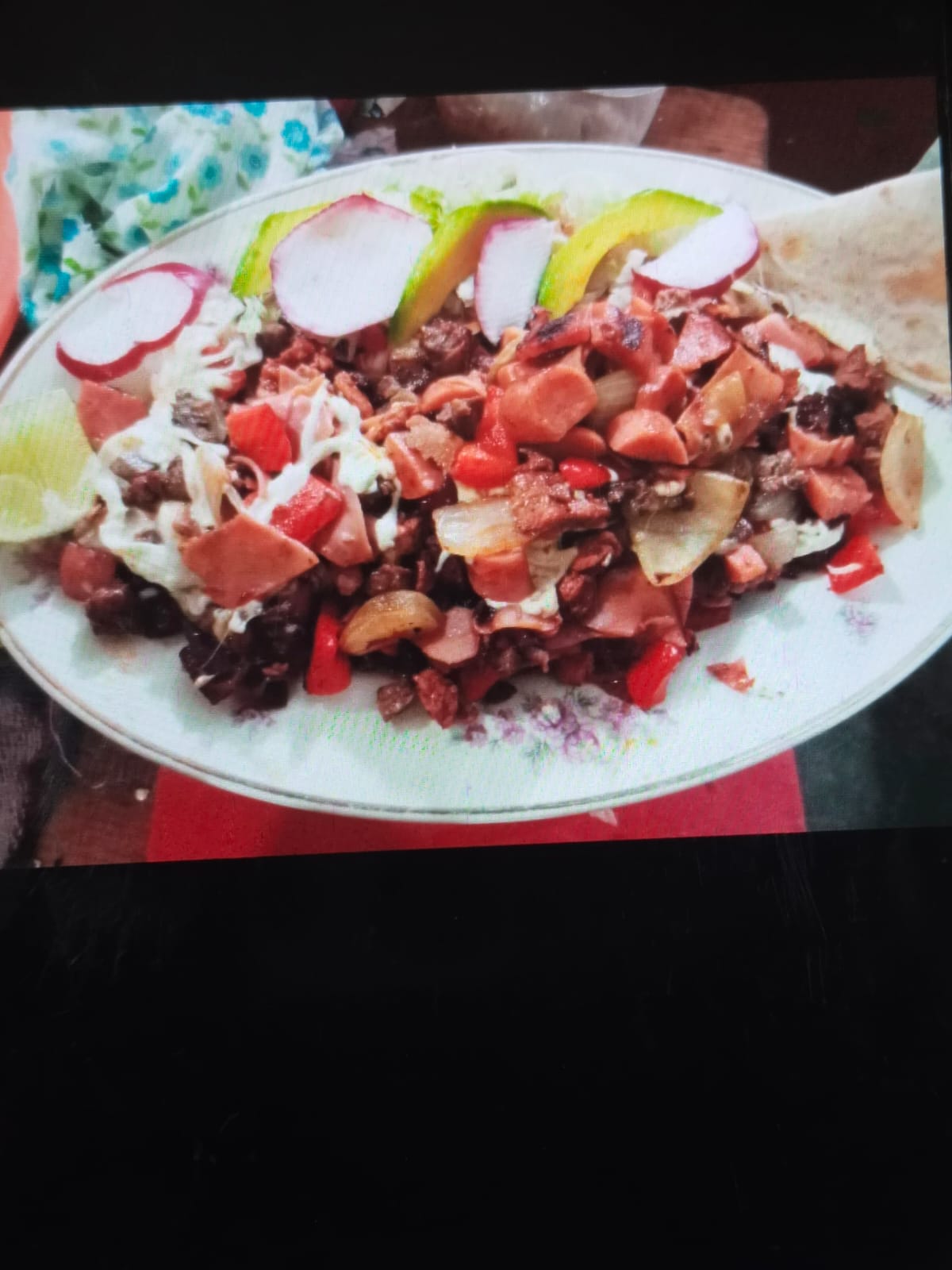 Salchicha, jamón, tocino, cebolla, chile morrón, carne asada o al pastor, acompañado de tortillas y ensalada.