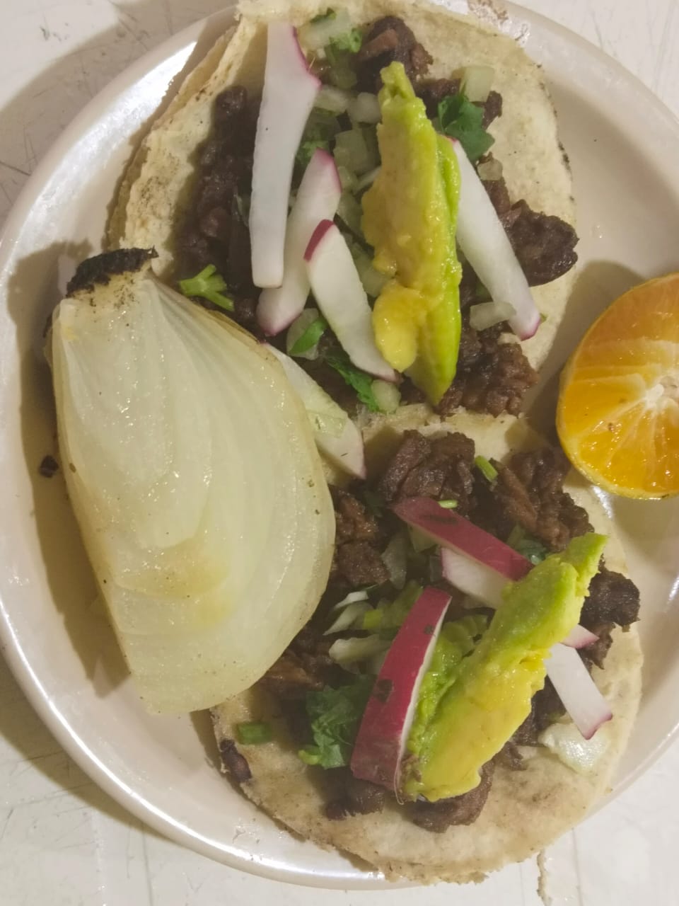 Tortilla de maíz con frijoles, quesillo, repollo, carne asada con pastor, acompañados con aguacate, rábanos y cebollitas asadas.