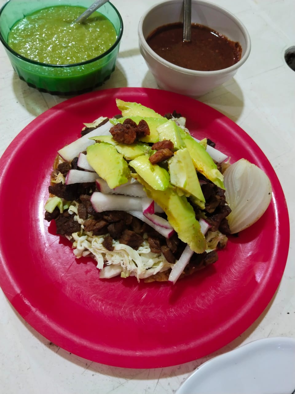 Tortilla de maíz con frijoles, quesillo, repollo, carne asada con chorizo, acompañados con aguacate, rábanos y cebollitas asadas.
