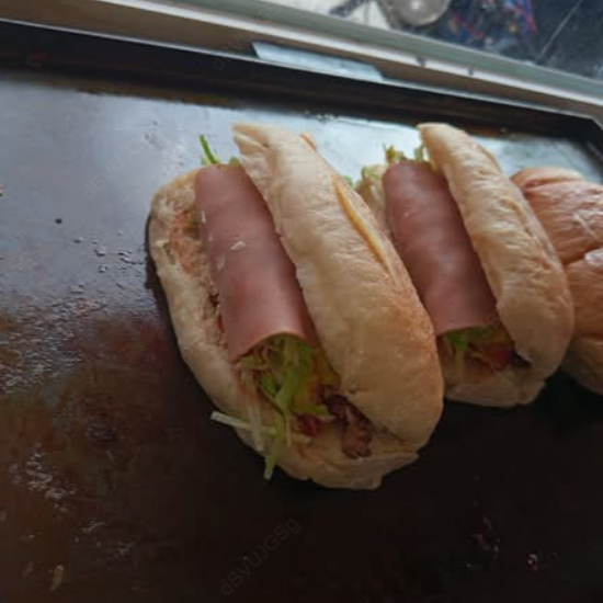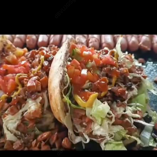 Salchicha, jamón, tomate, cebolla y cátsup.