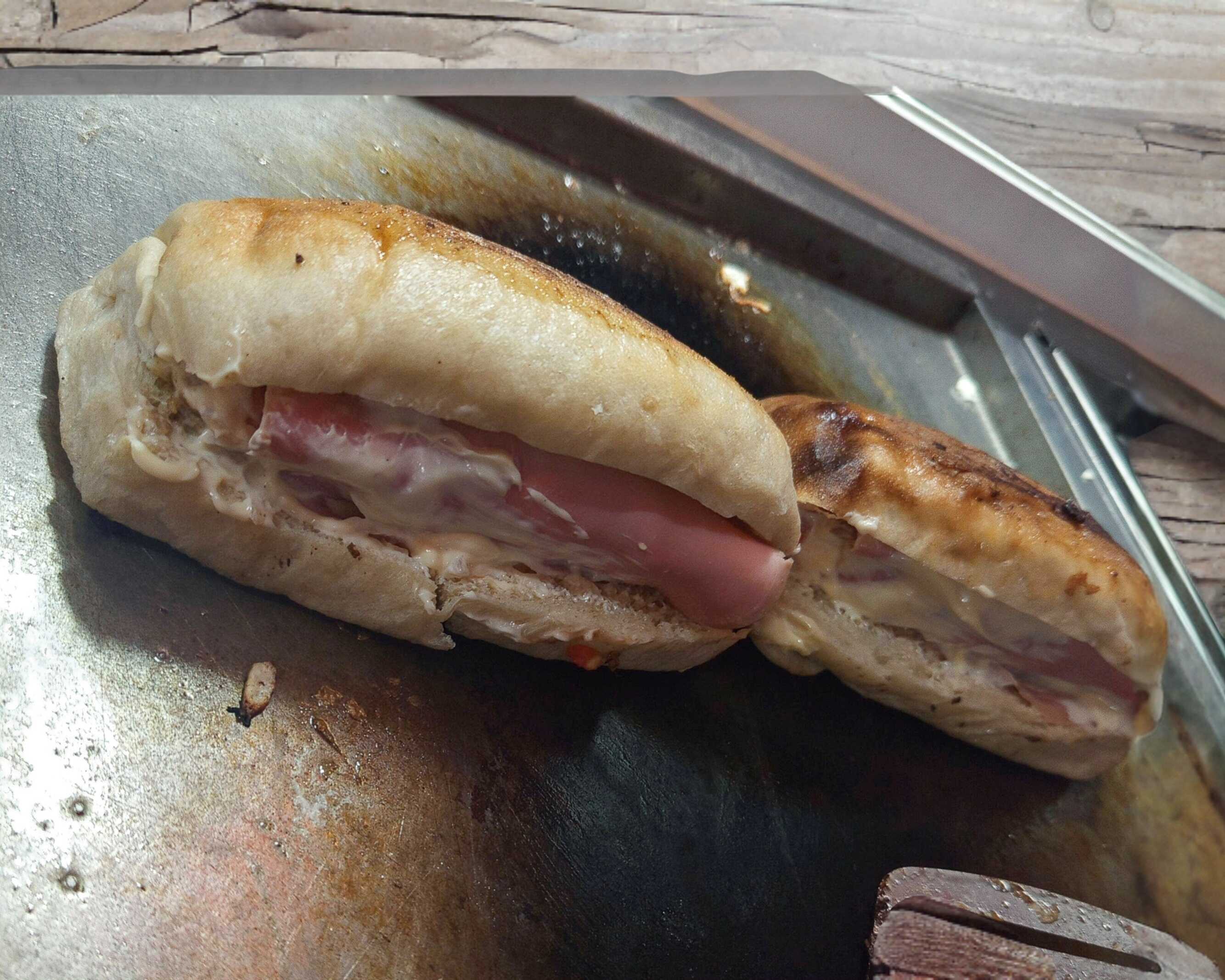Relleno de jamon y salchicha picada,lechcuga, tomate,quesillo,cebolla,mayonesa,catsup, con picante aparte