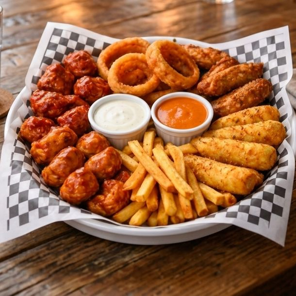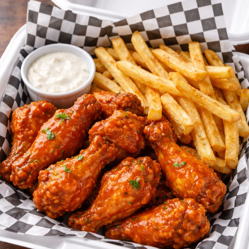 Boneless 250gr*1 + Papas a la Francesa*1 + Dedos de Queso*1 + Aros de Cebolla*1 + Alitas*1