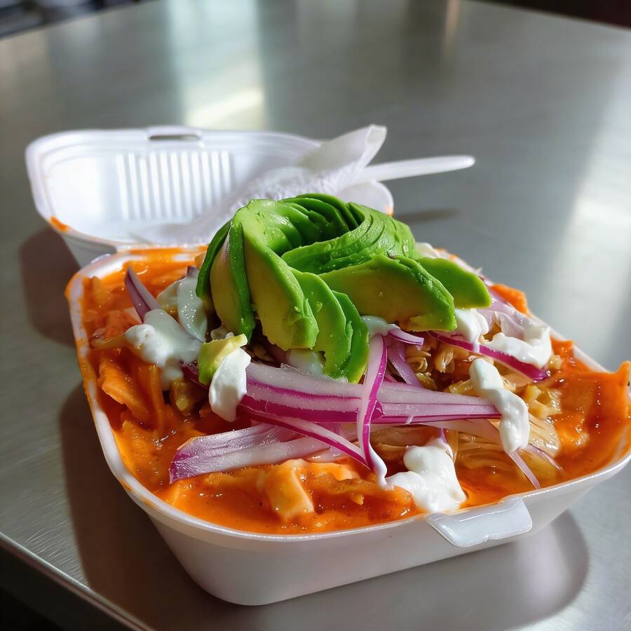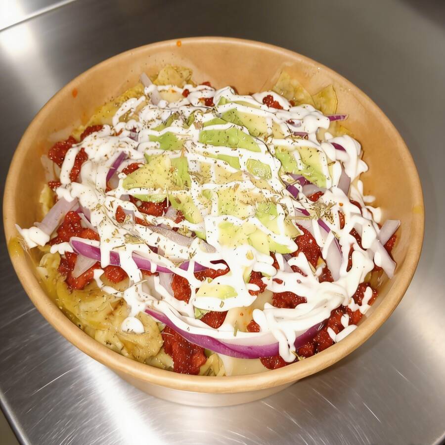Xhilaquiles de Sartén ( 10 tortillas ) con Chorizo Español , en salsa suiza Roja y queso , cubiertos de queso manchego , crema , cebolla morada , aguacate y especias. NO PICANTE , Añadir nota solo si se requieren elaborados con Totopo .