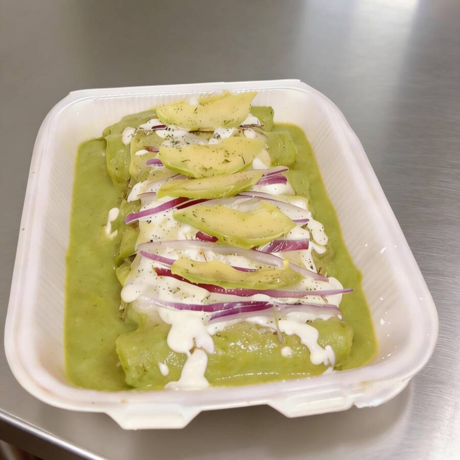 10 Enchiladas Rellenas de pollo , bañadas en salsa Suiza Verde , Gratinadas de queso manchego y Oaxaca , cubiertas con crema , cebolla morada , aguacate y especias . NO PICANTE