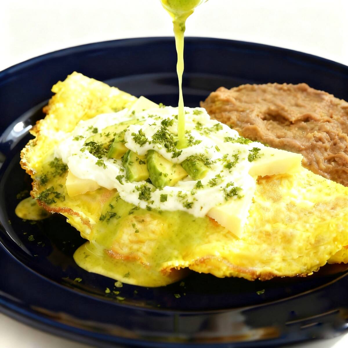 Gran y Delicioso Omelette de huevo con jamón y queso , bañado en salsa suiza verde o roja ( especificar ) Gratinado con queso manchego , cubierto de crema , aguacate y especias . Incluye frijolitos refritos , tortillas y picante.
