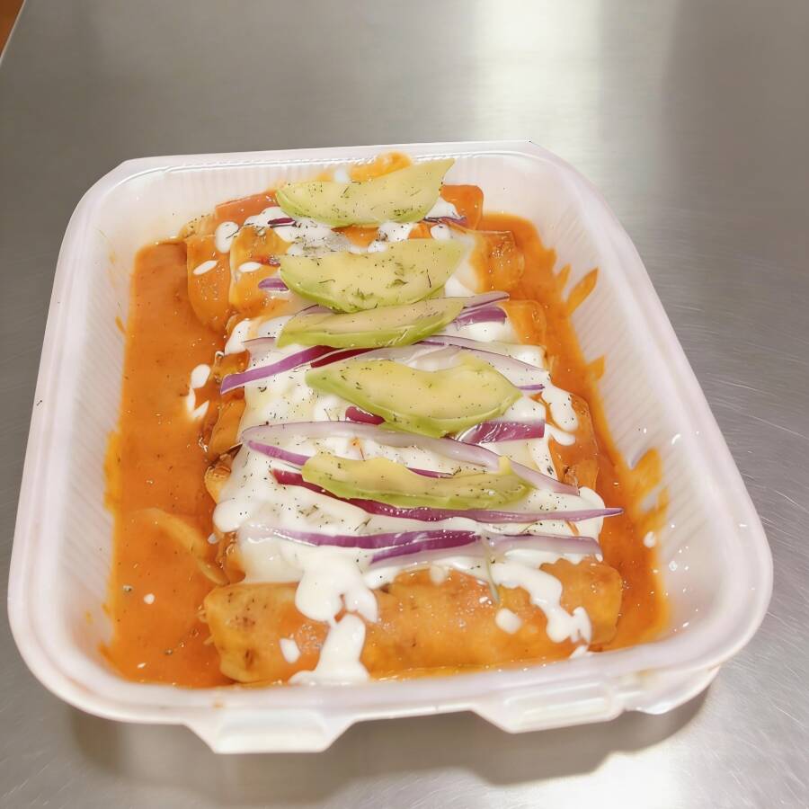 10 enchiladas Rellenas de pollo , bañadas en salsa Suiza Roja , Gratinadas con queso manchego y Oaxaca, cubiertas de crema , cebolla morada , aguacate y especias . NO PICANTE