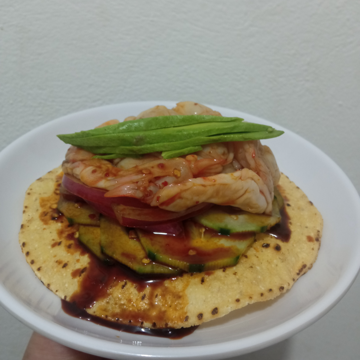 Tostada con camarones enteros, rodajas de pepino y cebolla, acompañada de la salsa a elegir.