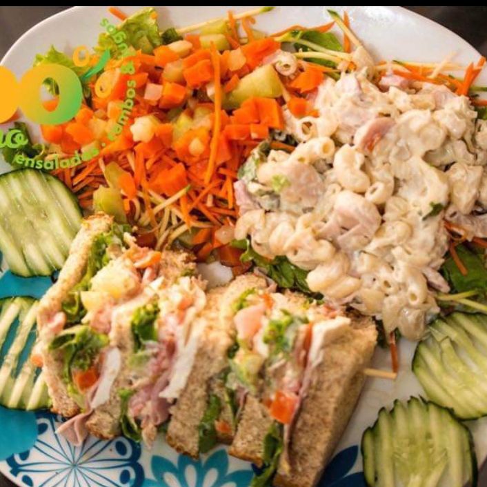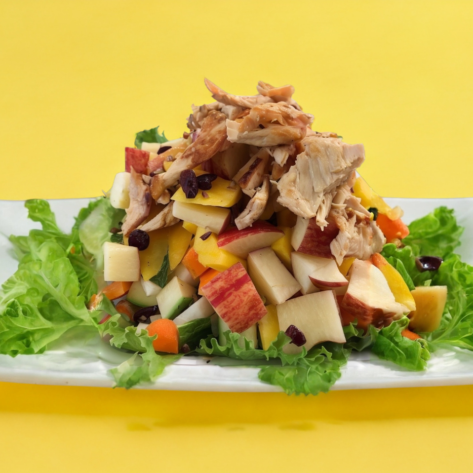 Base de lechuga hidropónica, zanahoria y jícama rallada, pechuga a la plancha en fajitas, manzana, arándanos y nuez, bañadas en yogurt natural.