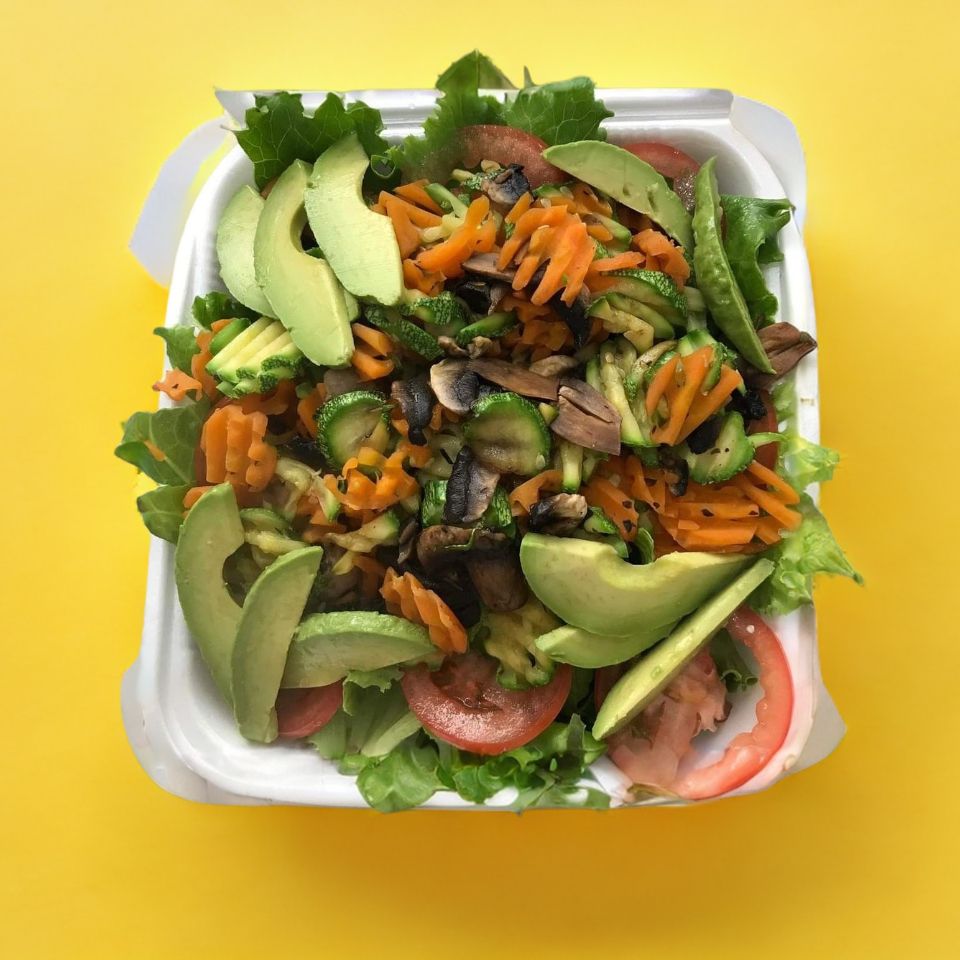 Base de lechuga hidropónica, zanahoria y jícama rallada, pechuga a la plancha en fajitas, calabacitas y zanahoria hervida, champiñones y aguacate.