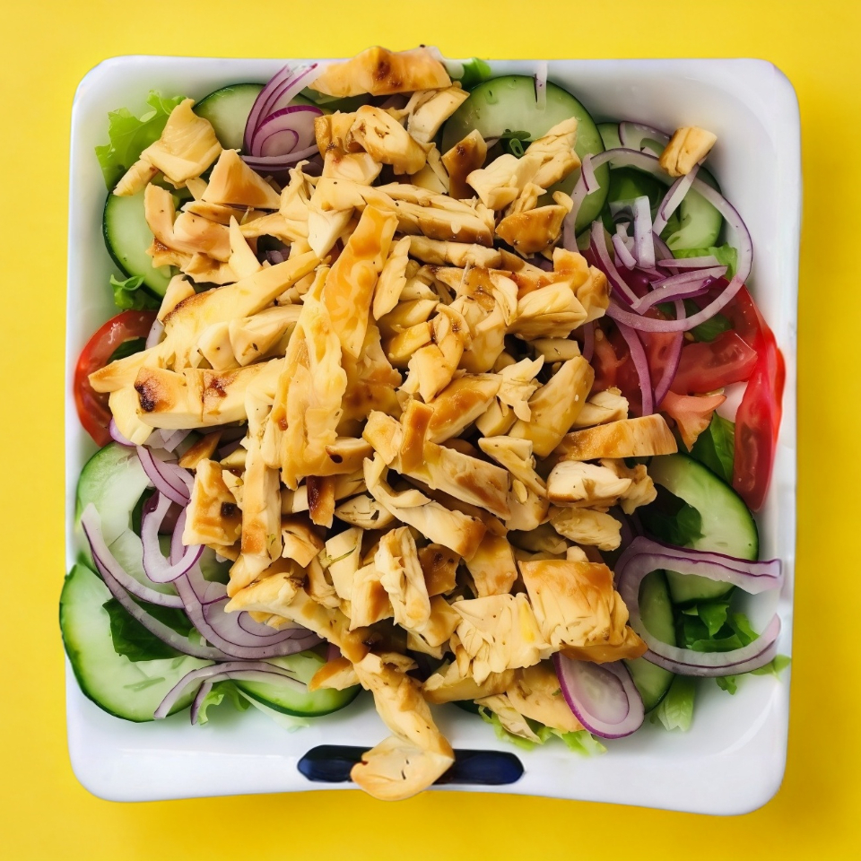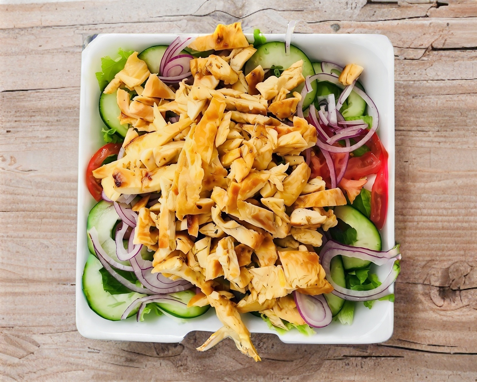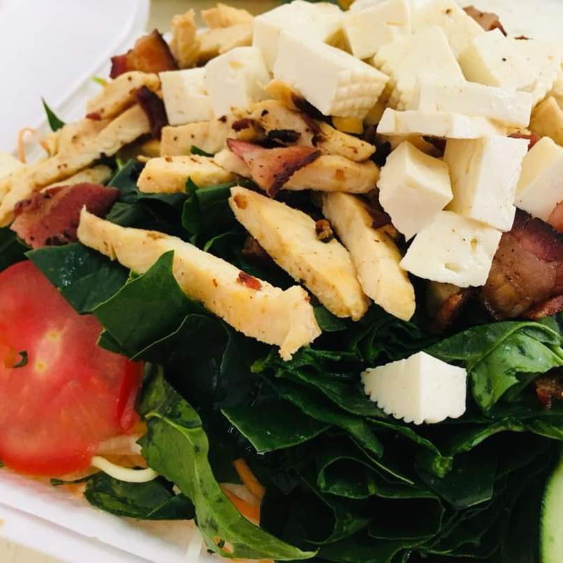 Base de lechuga hidropónica, zanahoria y jicama rallada, pechuga a la plancha en fajitas, espinaca, tocino, queso panela en cubos.