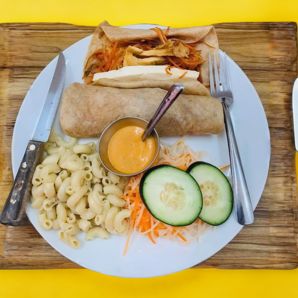 Base de lechuga hidropónica, zanahoria y jicama rallada, pechuga a la plancha en fajitas, espinaca y queso panela.