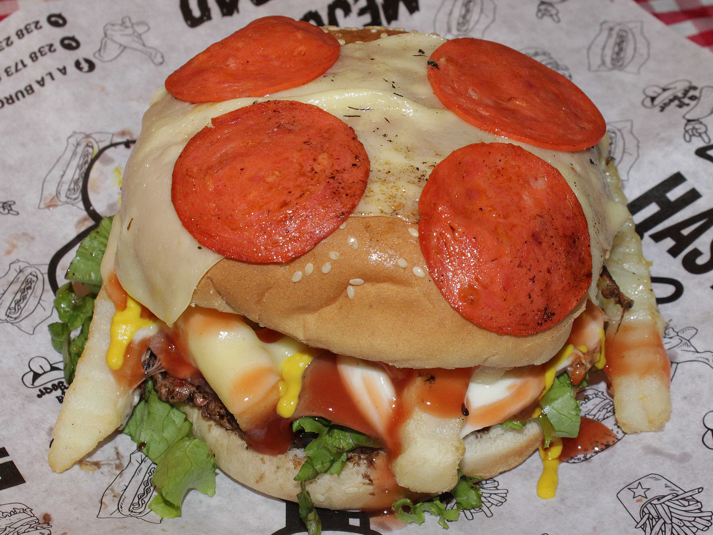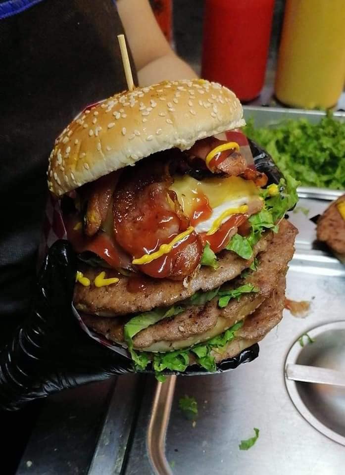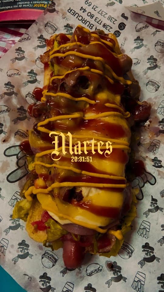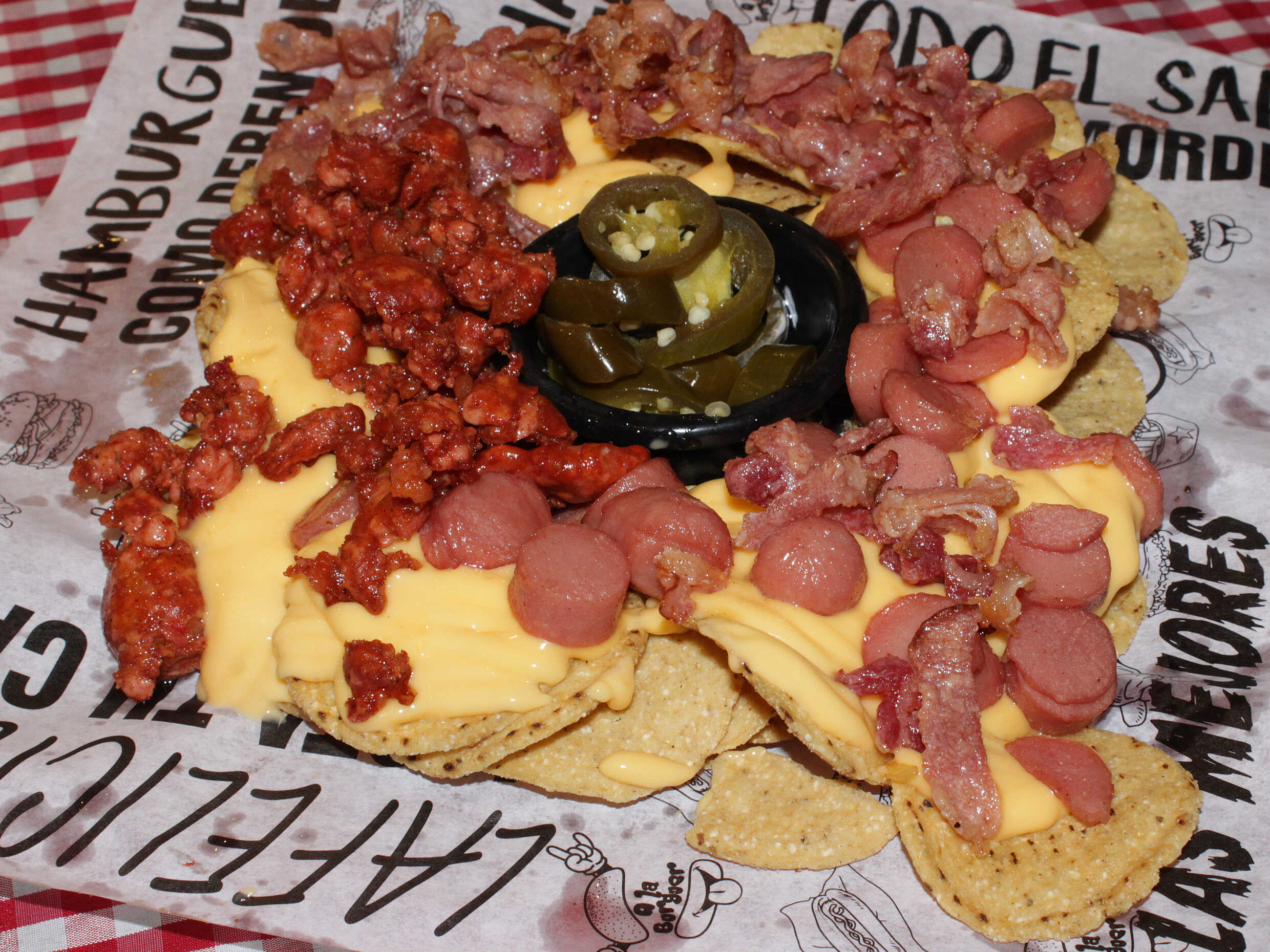 Tres carnes, doble pan, quesillo, queso manchego, queso amarillo, tocino y salchicha.