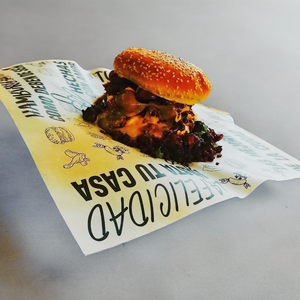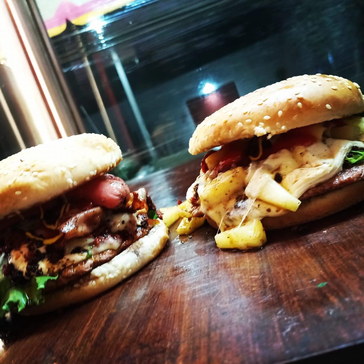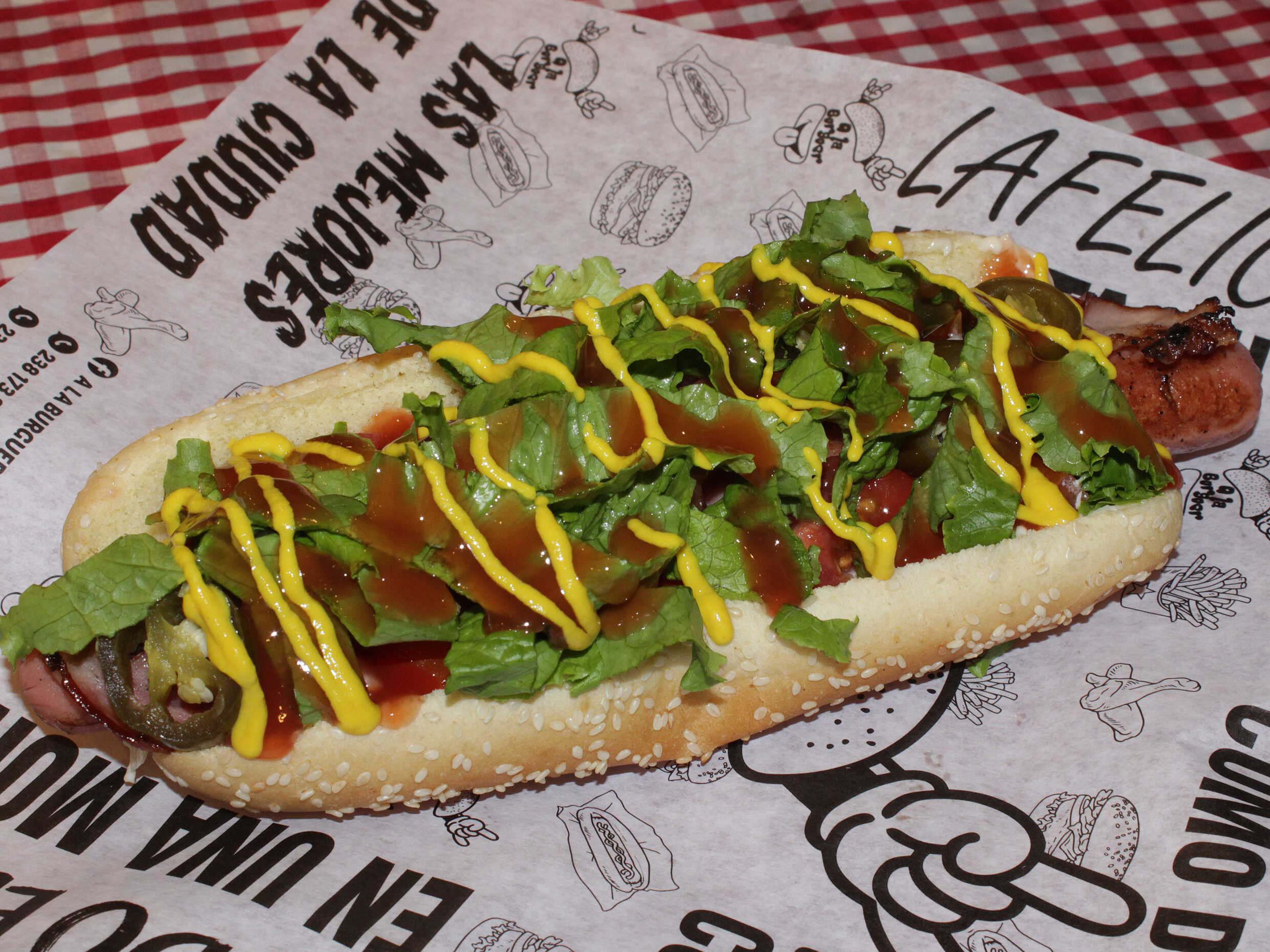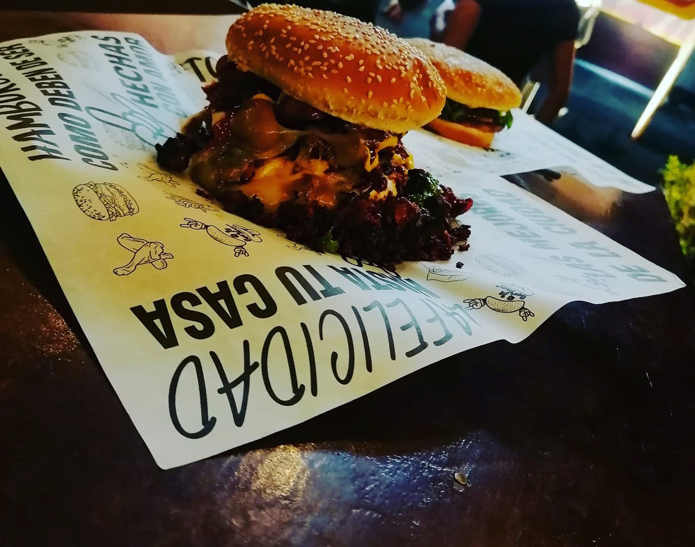 Tres carnes, doble pan, quesillo, queso manchego, queso amarillo, tocino y salchicha.