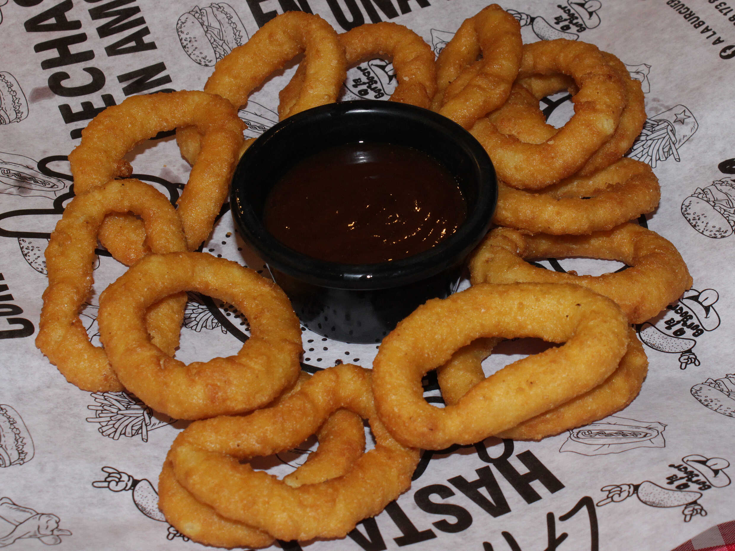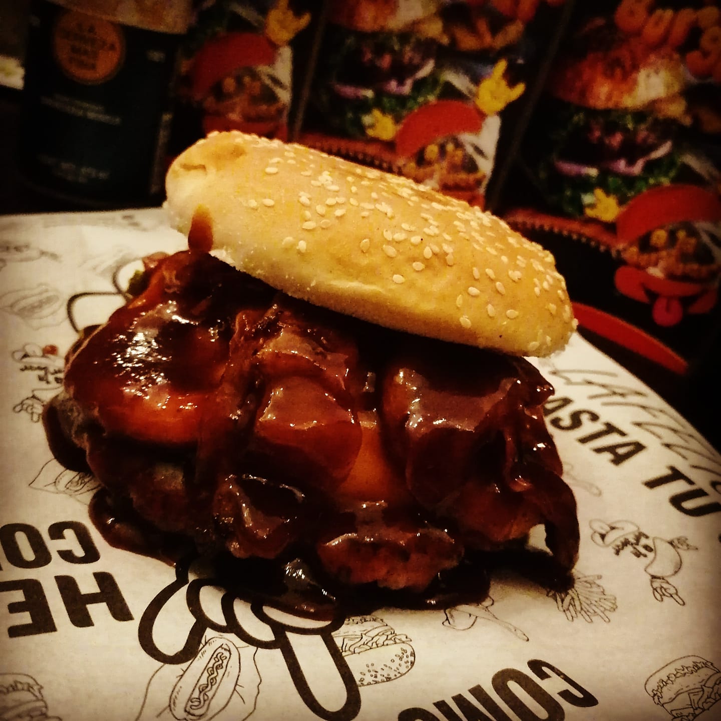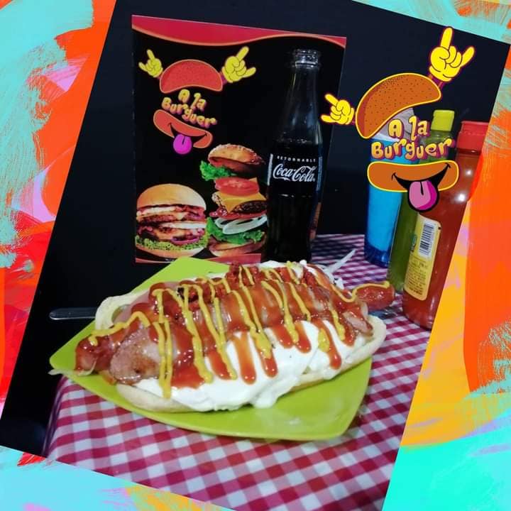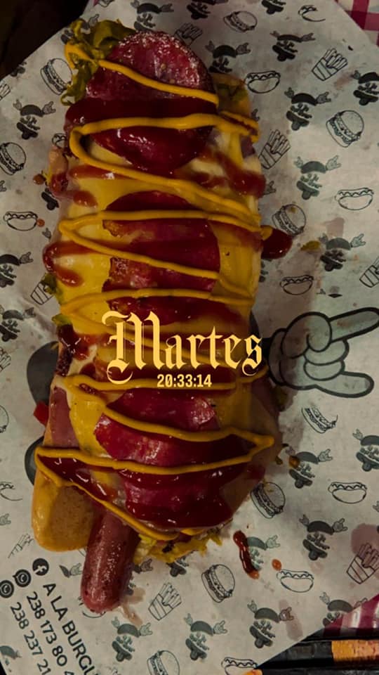Salchicha, aros de cebolla, tocino, salsa BBQ, jamón y queso manchego.