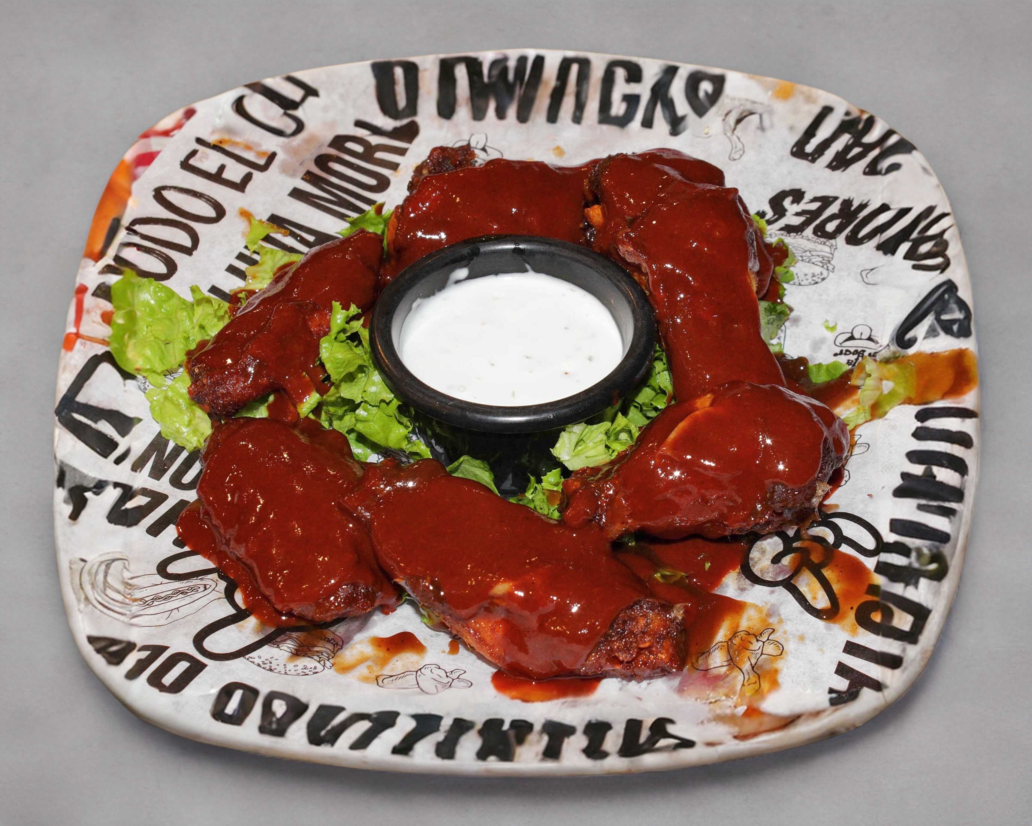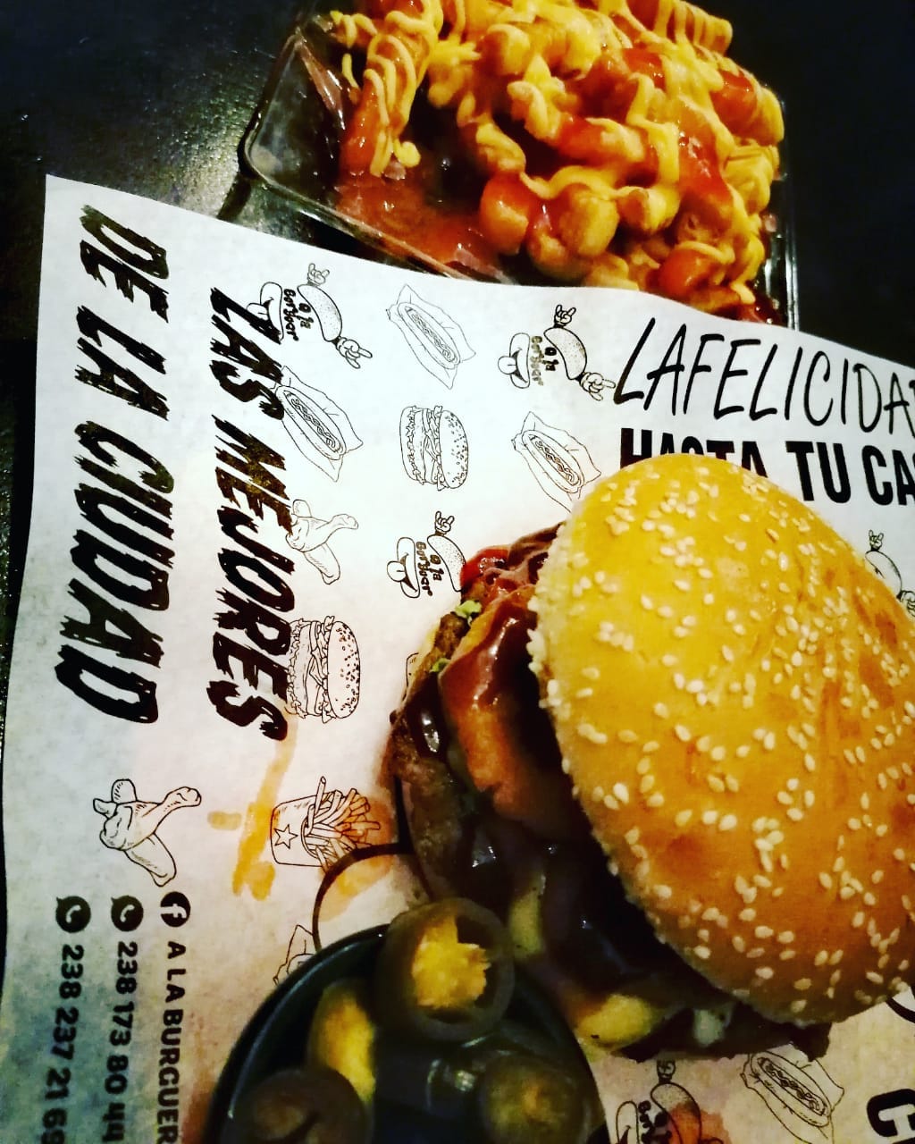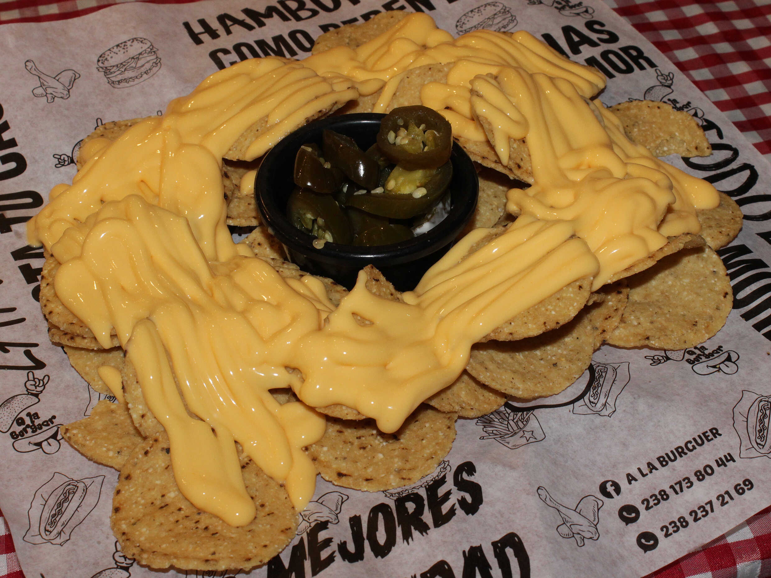 Salchicha, aros de cebolla, tocino, salsa BBQ, jamón y queso manchego.
