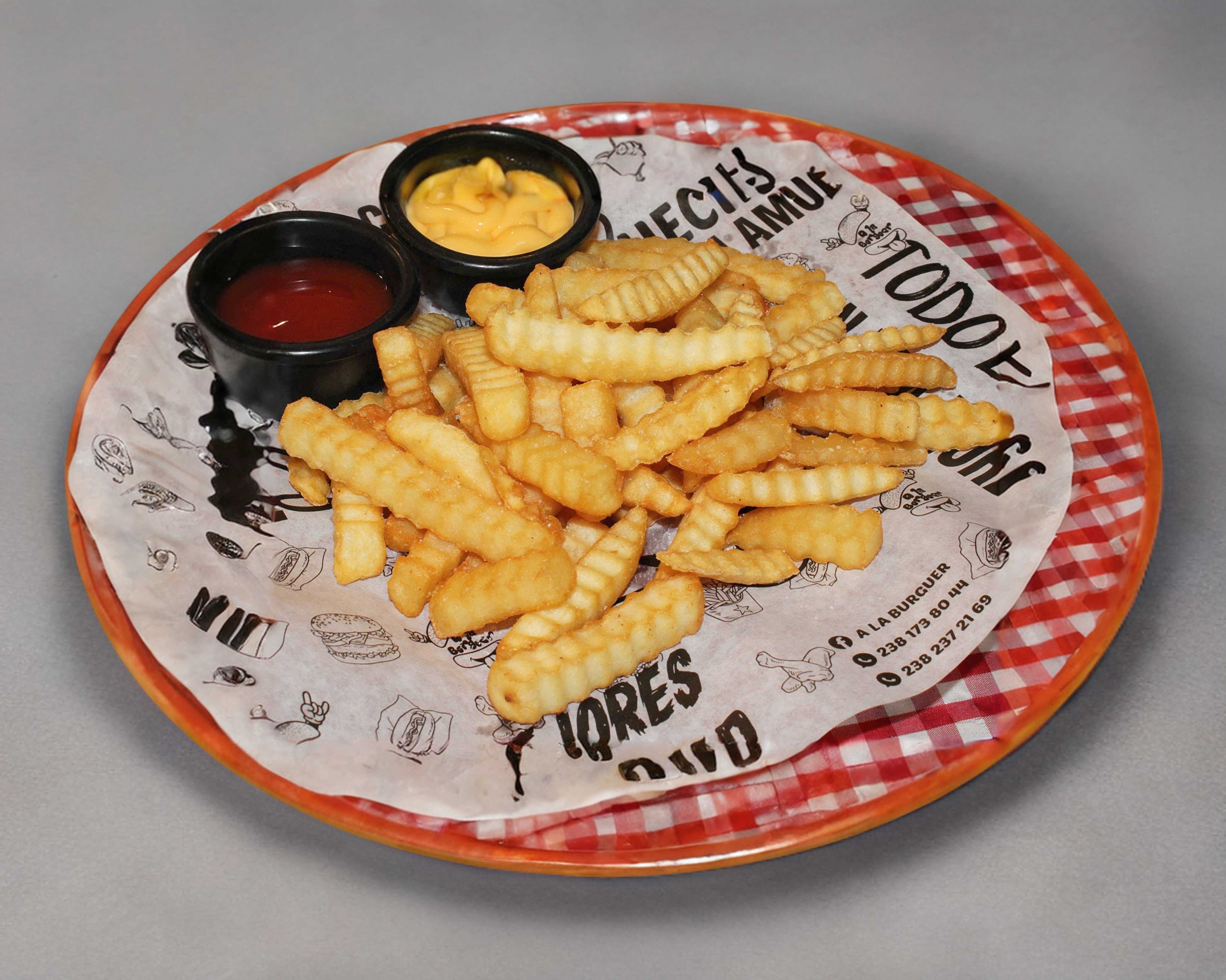 Salchicha, pepperoni, jamón, papas, quesillo y queso manchego.