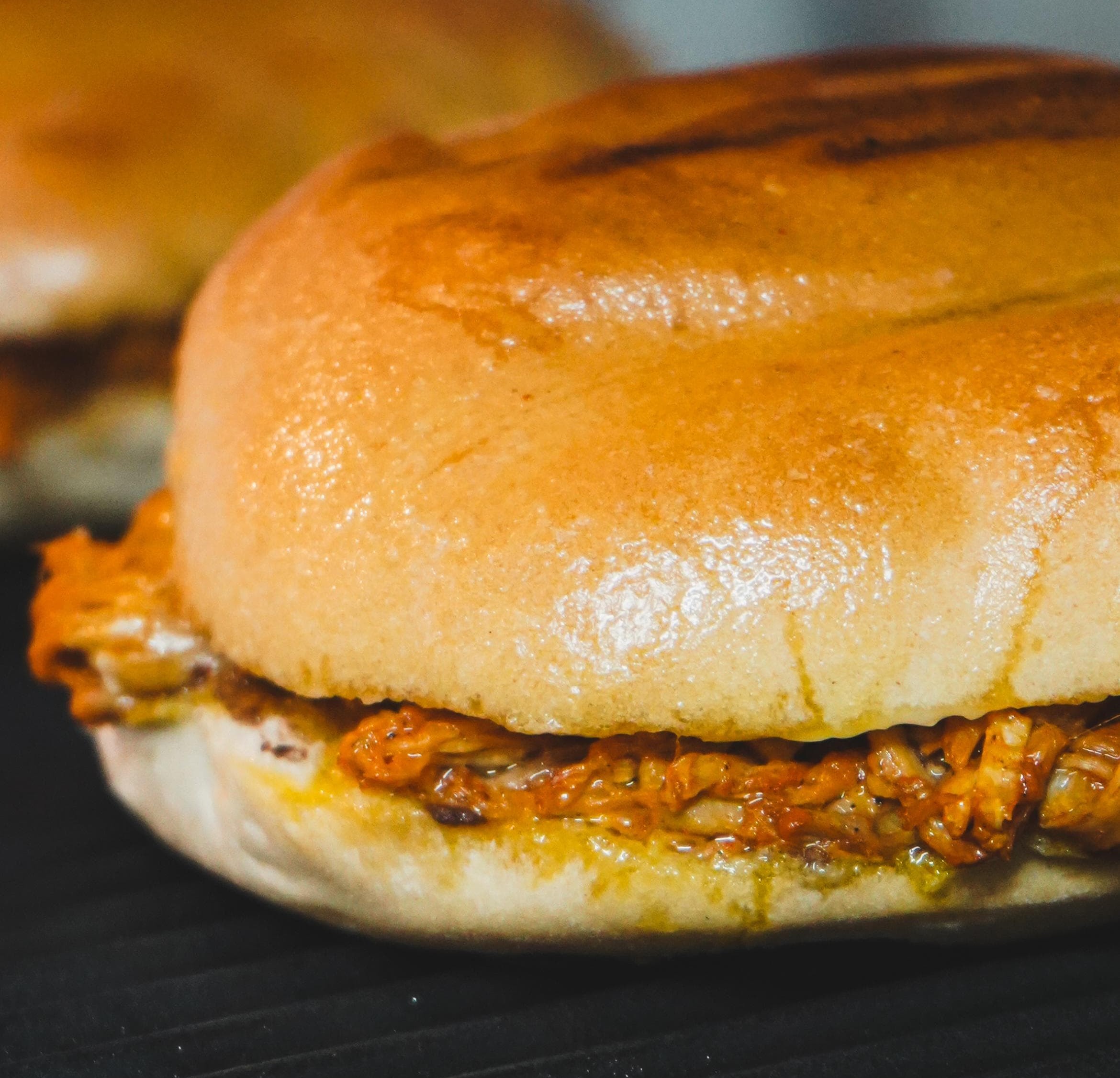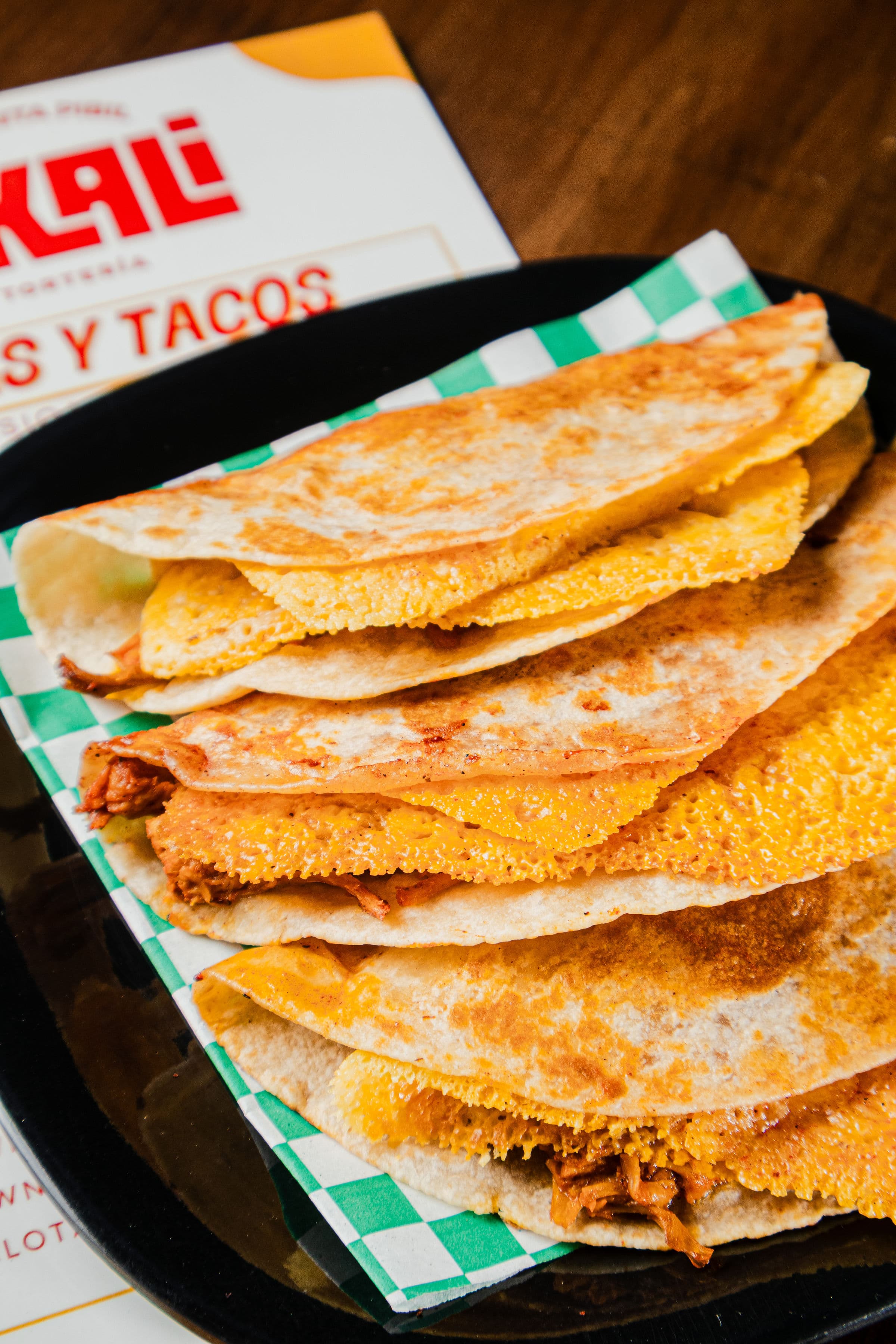 Tortilla de harina con queso gouda tostado a la plancha relleno de deliciosa cochinita.