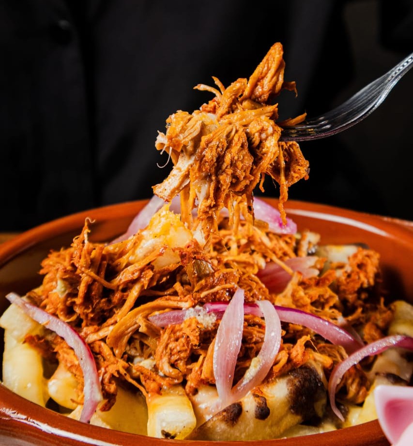 Papas doraditas en airfryer con frijoles, queso gouda derretido y cochinita.