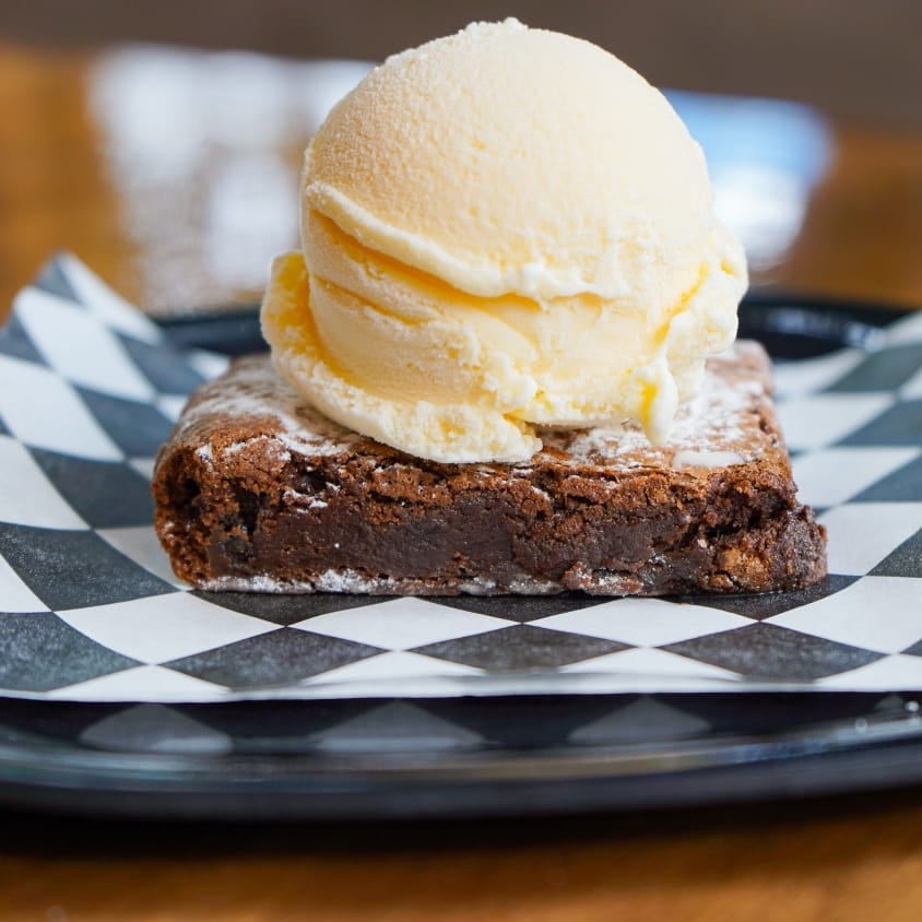 Brownie calientito con helado de vainilla encima, por fuera crujiente, por dentro suave y chocolatoso, con el toque frío y cremoso que lo vuelve perfecto.