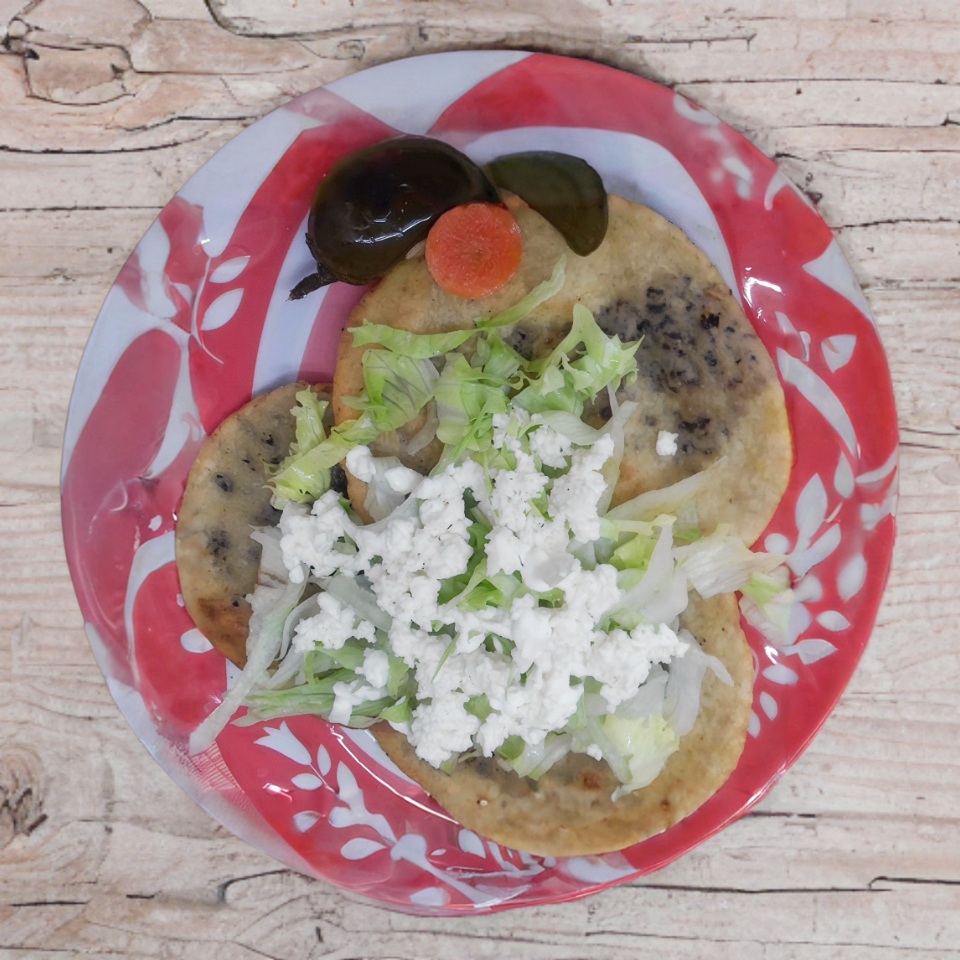 Memelas fritas con frijoles, lechuga, queso, crema y picante a elegir