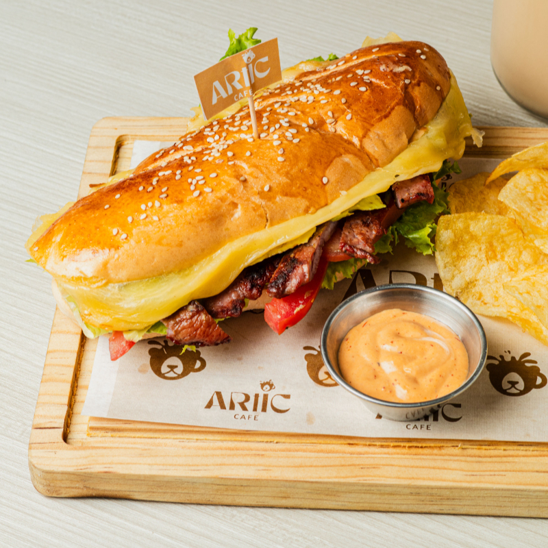 Jamón, manchego, peperoni, tocino, mayonesa. Acompañado de papas y aderezo chipotle.