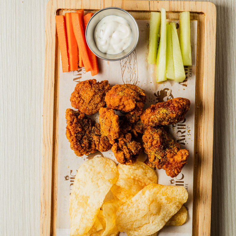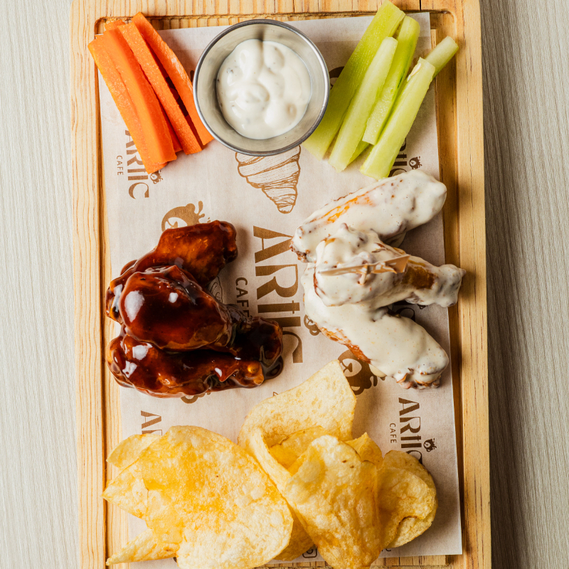 Deliciosas alitas acompañadas de pepino, zanahoria, papas y aderezo ranch.