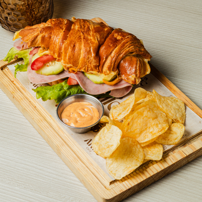 Jamón de pavo, manchego, lechuga, mayonesa. Acompañado de papas y aderezo chipotle.