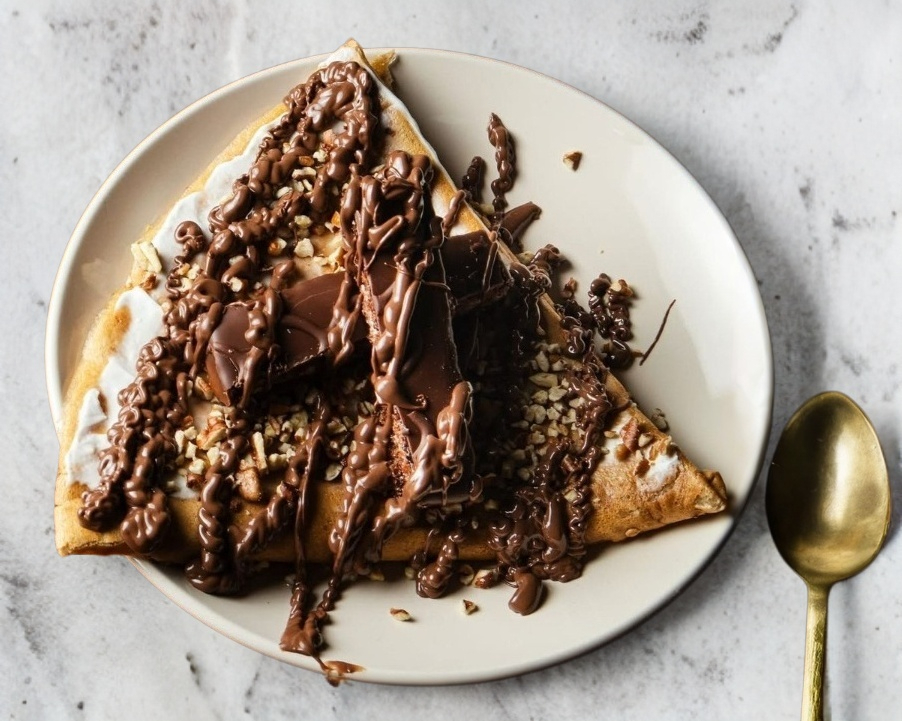 Crepa a base de queso philadelphia, nuez quebrada, chocolate Kinder Delice, bañado en Nutella
