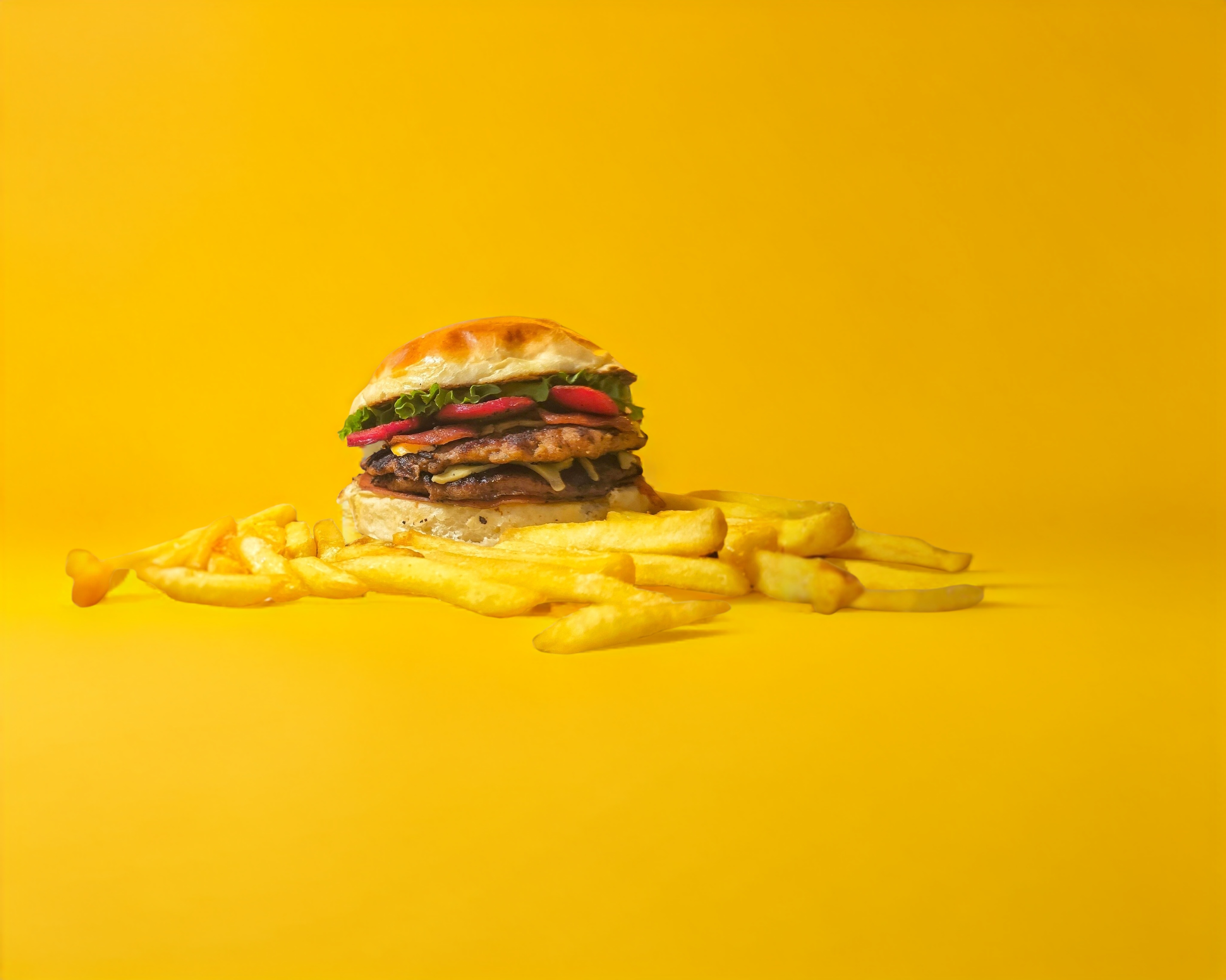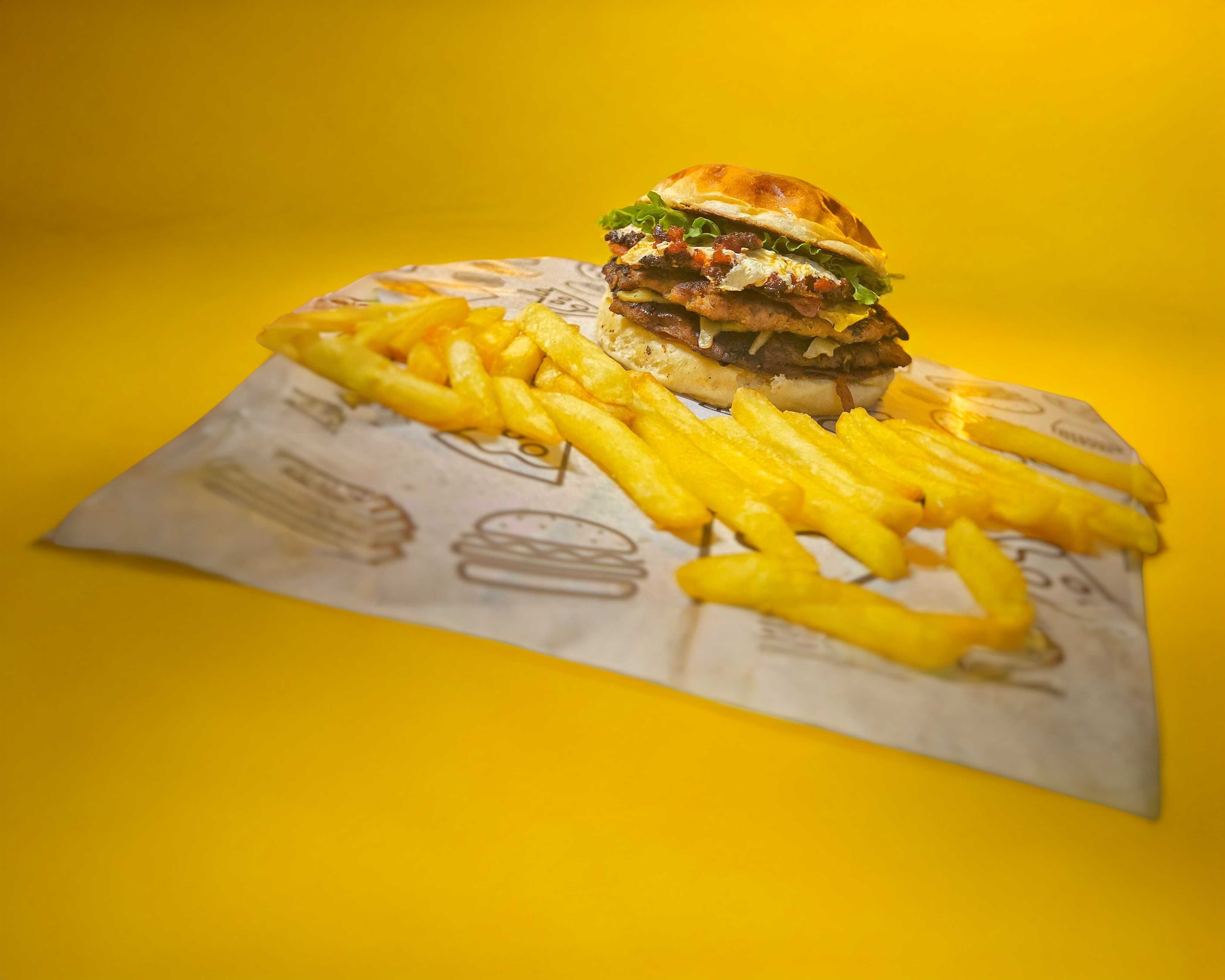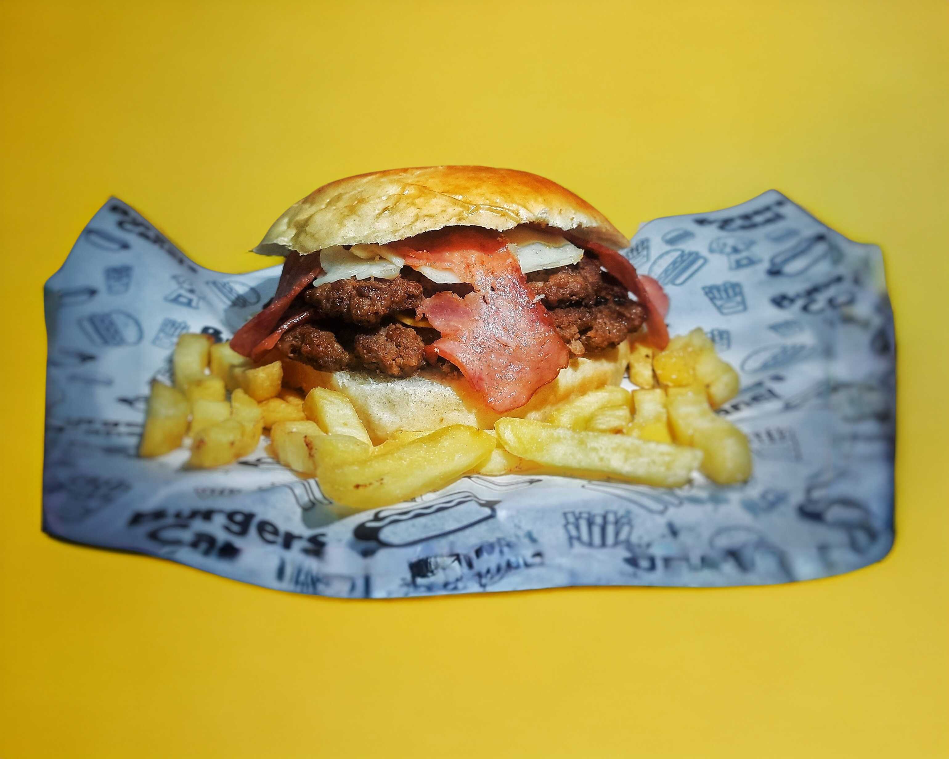 Hamburguesa doble de res o puerco 300 g, queso amarillo, queso manchego, tocino, aderezo, verduras, con su porción de papas.
