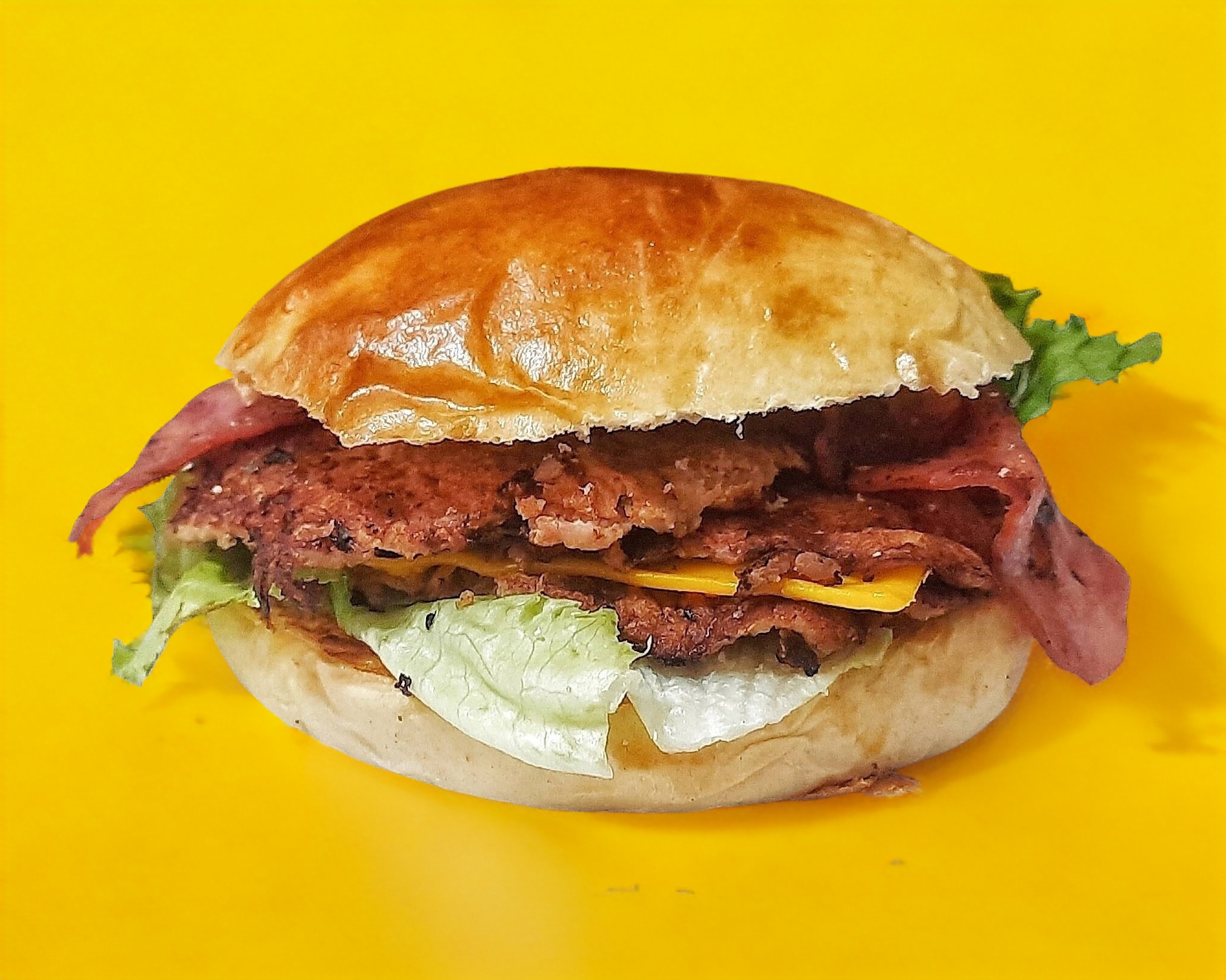 Hamburguesa con pan brioche, X2 carnes de cerdo 102 gramos, queso amarillo, tocino, aderezo, verduras.