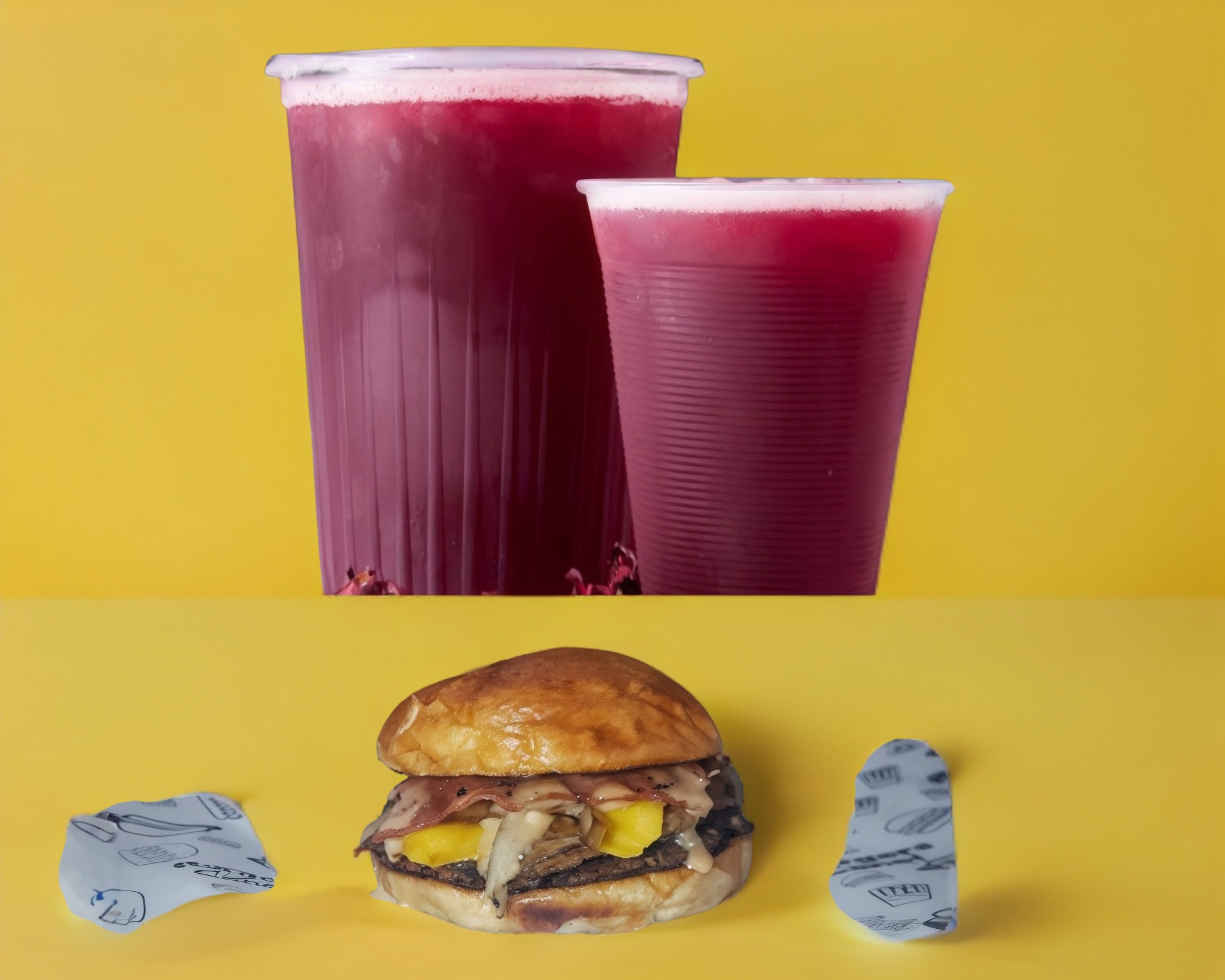 Pan brioche, X2 carnes smash 90 gr de puerco, piña asada, jamón, queso amarillo, tocino, queso gouda, verduras opcional, su porción de papa