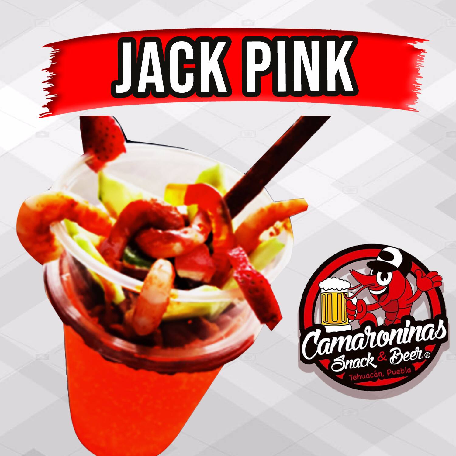 Jugo de limón, licor de fresa, volt rosa, escarchado de Miguelito, cerveza camarones, gomitas, pepino y chamoy
