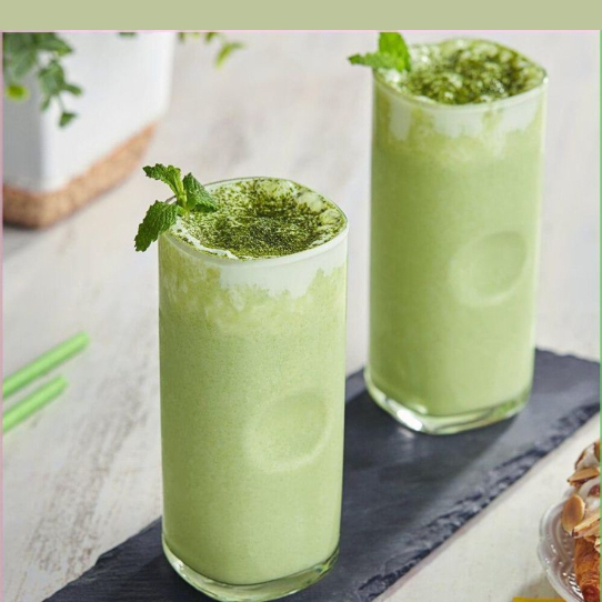 Bebida Refrescante y cremosa, hecha a base de té verde matcha polvo, leche, hielo triturado