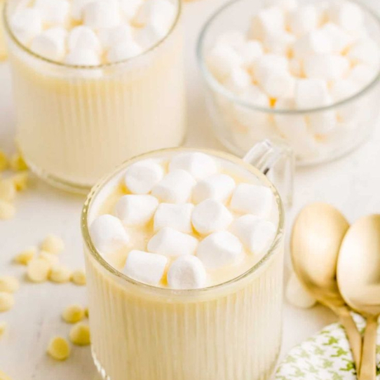 Bebida caliente elaborada con expresso, trozos de chocolate blanco y leche vaporizada