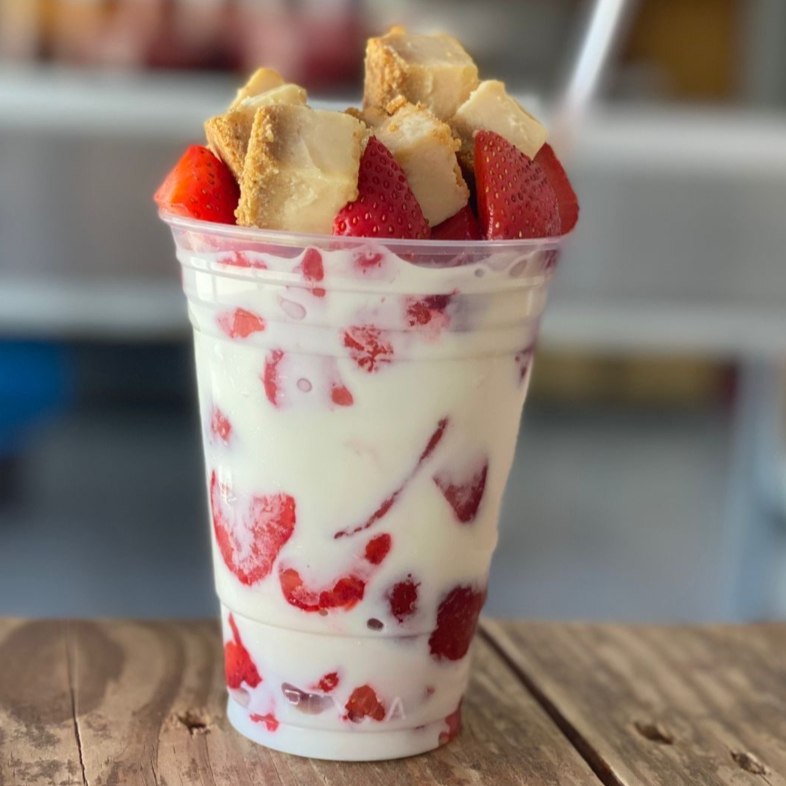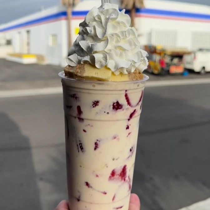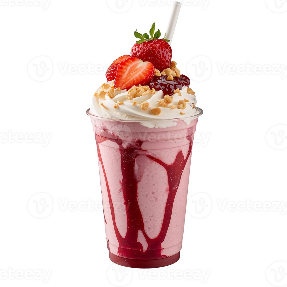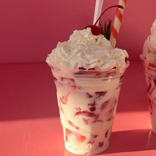 BEBIDA HELADA CREMOSA SABOR FRESA, CON LECHE ENTERA, AZUCAR, FRESA NATURAL Y CHANTILLYN