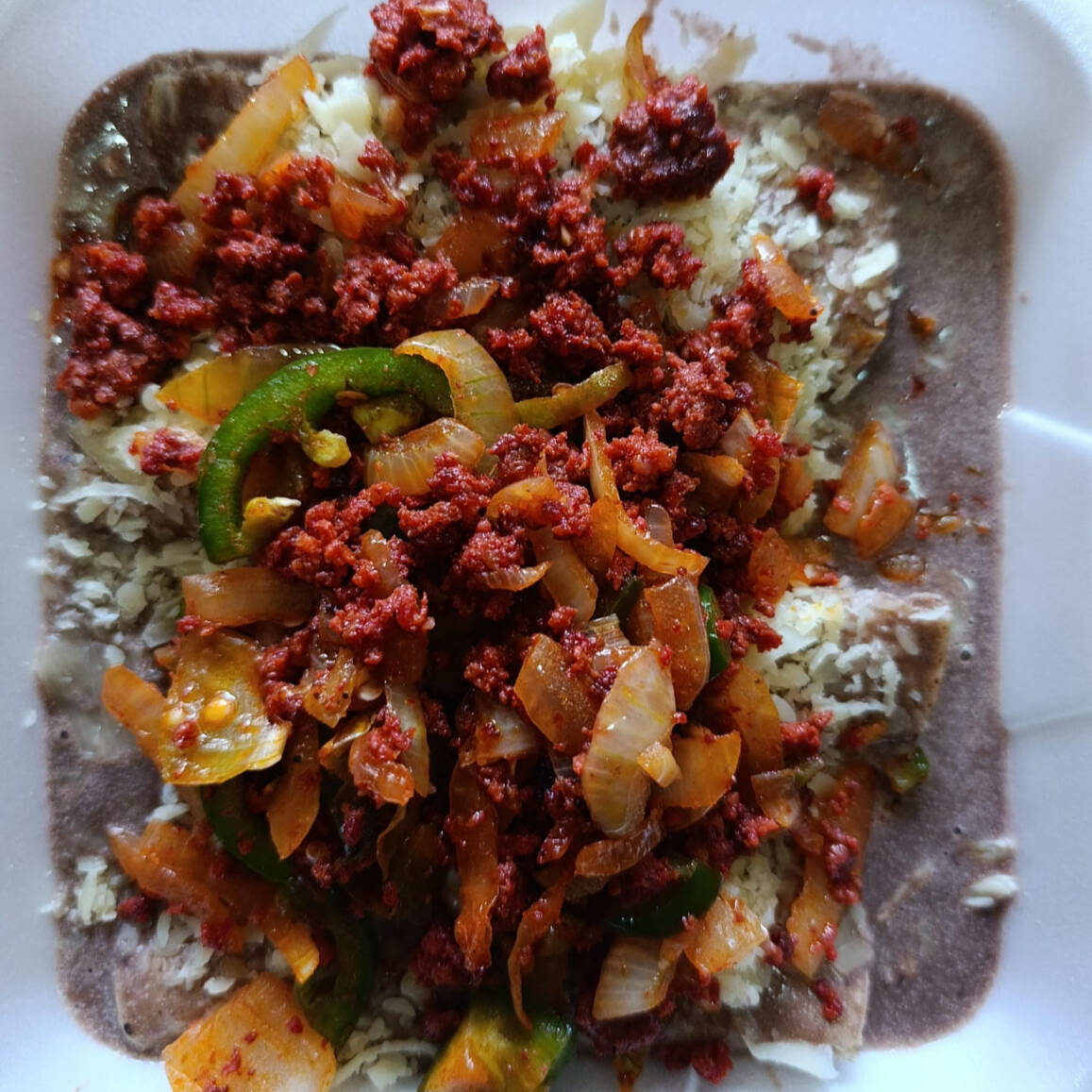 Fajitas de maiz con pollo blanco, bañadas en frijoles cremosos y acompañadas con chorizo frito con cebolla y jalapeño