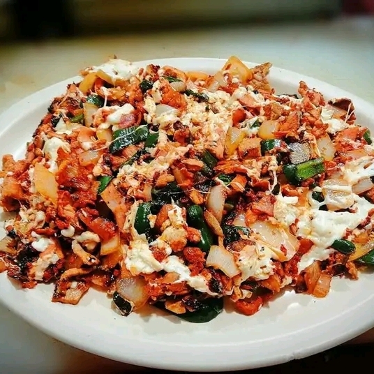 chile poblano, cebolla, carne arabe, carne al pastor,chorizo, queso, jamon