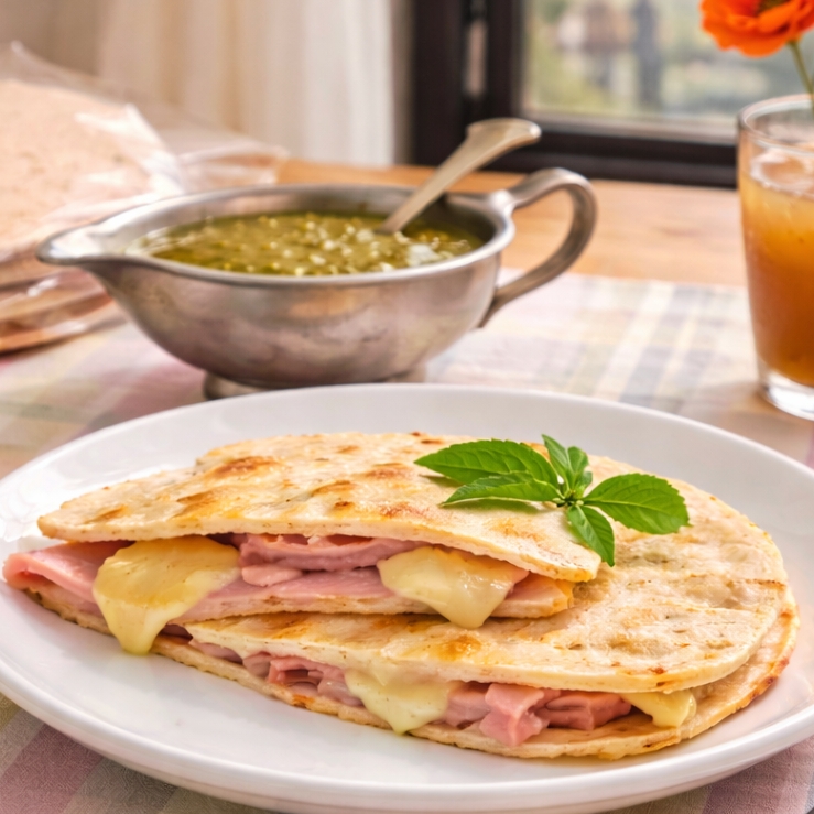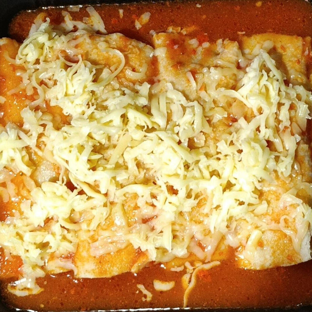 Fajitas de maiz con pollo blanco y bañadas en salsa de tomate y queso manchego al gratin