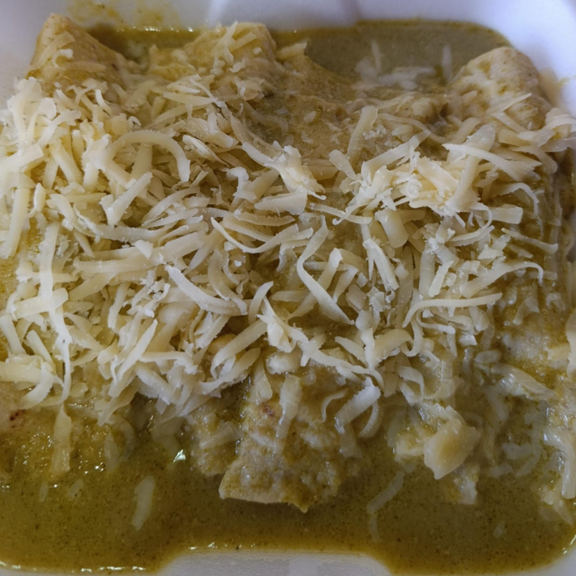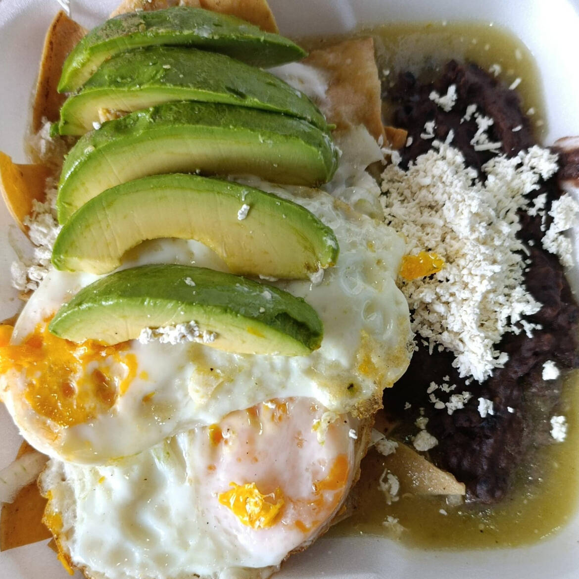 Tortillas de maiz en trozo bañadas en salsa verde acompaadas de frijoles refritos, queso, crema, cebolla y huevo.