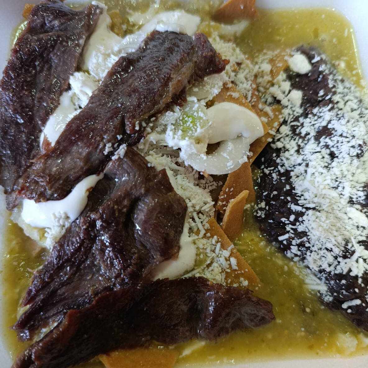 Tortillas de maiz en trozo bañadas en salsa verde acompaada con frijoles refritos queso y cecina asada