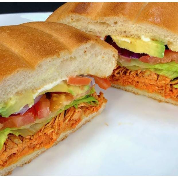 Pan integral con pechuga asada de pollo, lechuga, aguacate, jitomate y picante.