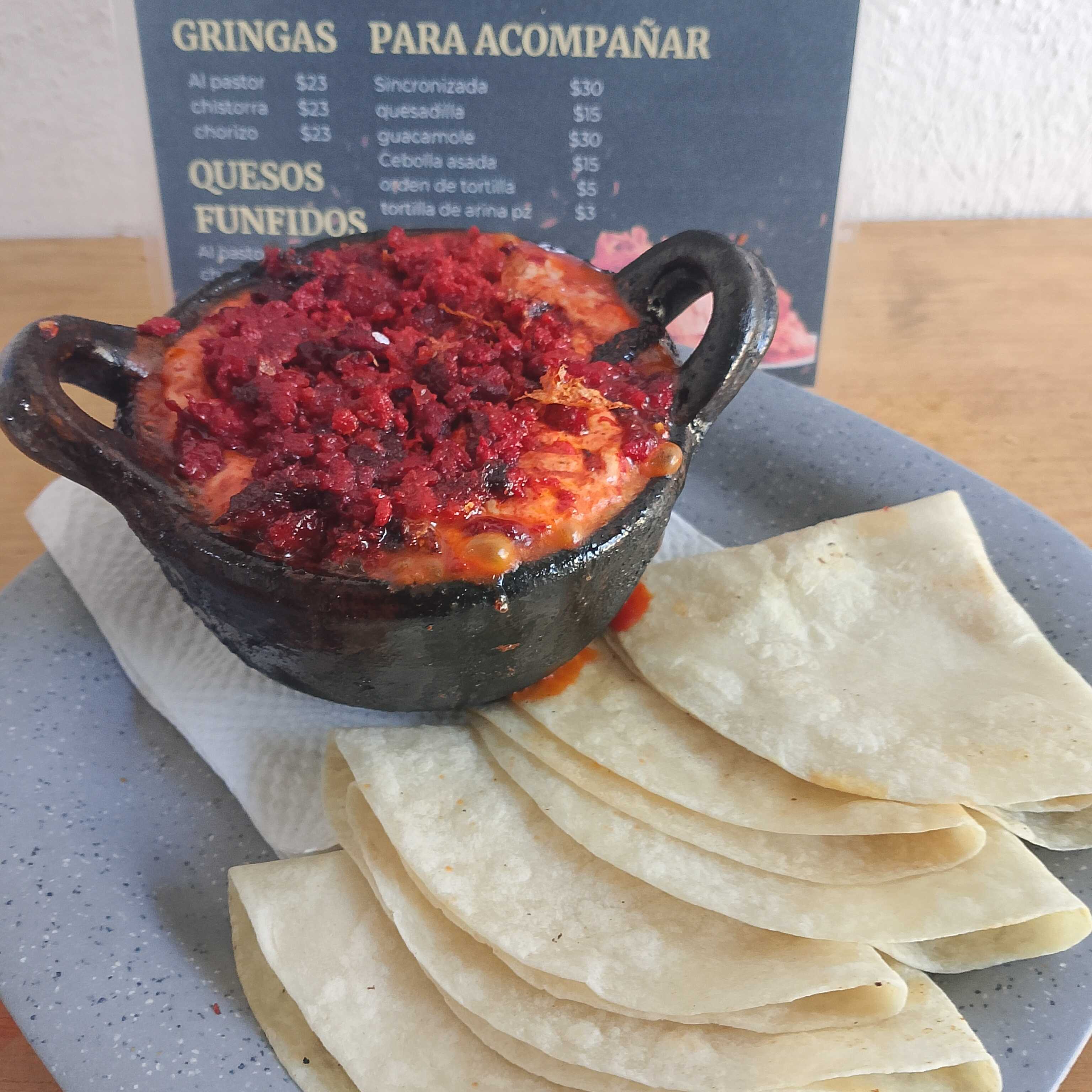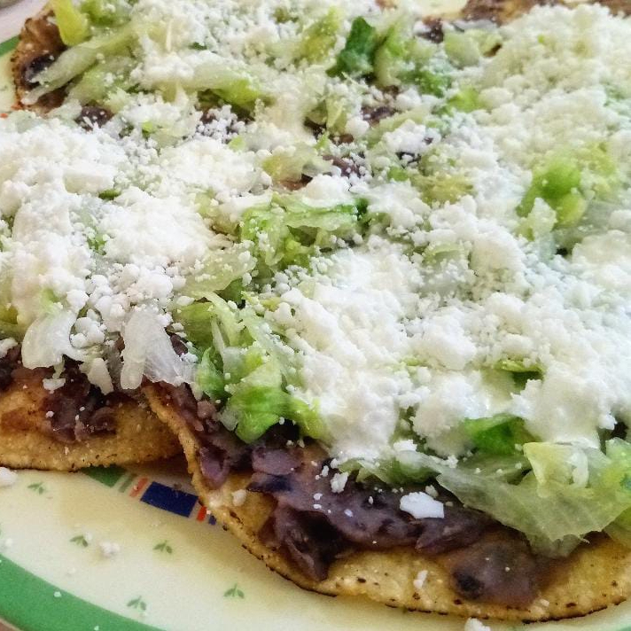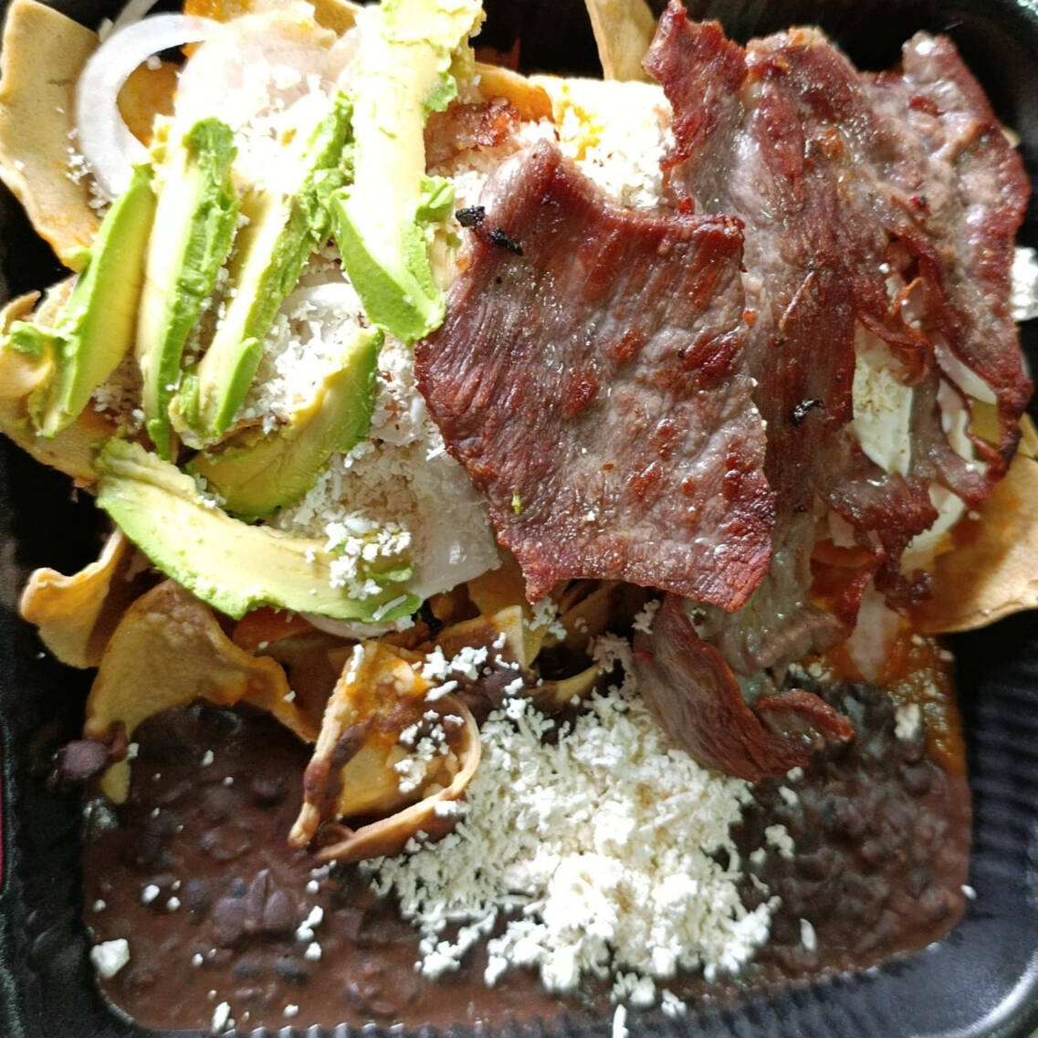 Tortillas en trozo bañadas en salsa roja con frijoles, queso crema, cebolla y cecina asada