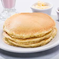 Hot cakes con mantequilla acompañados de mermelada y lechera.